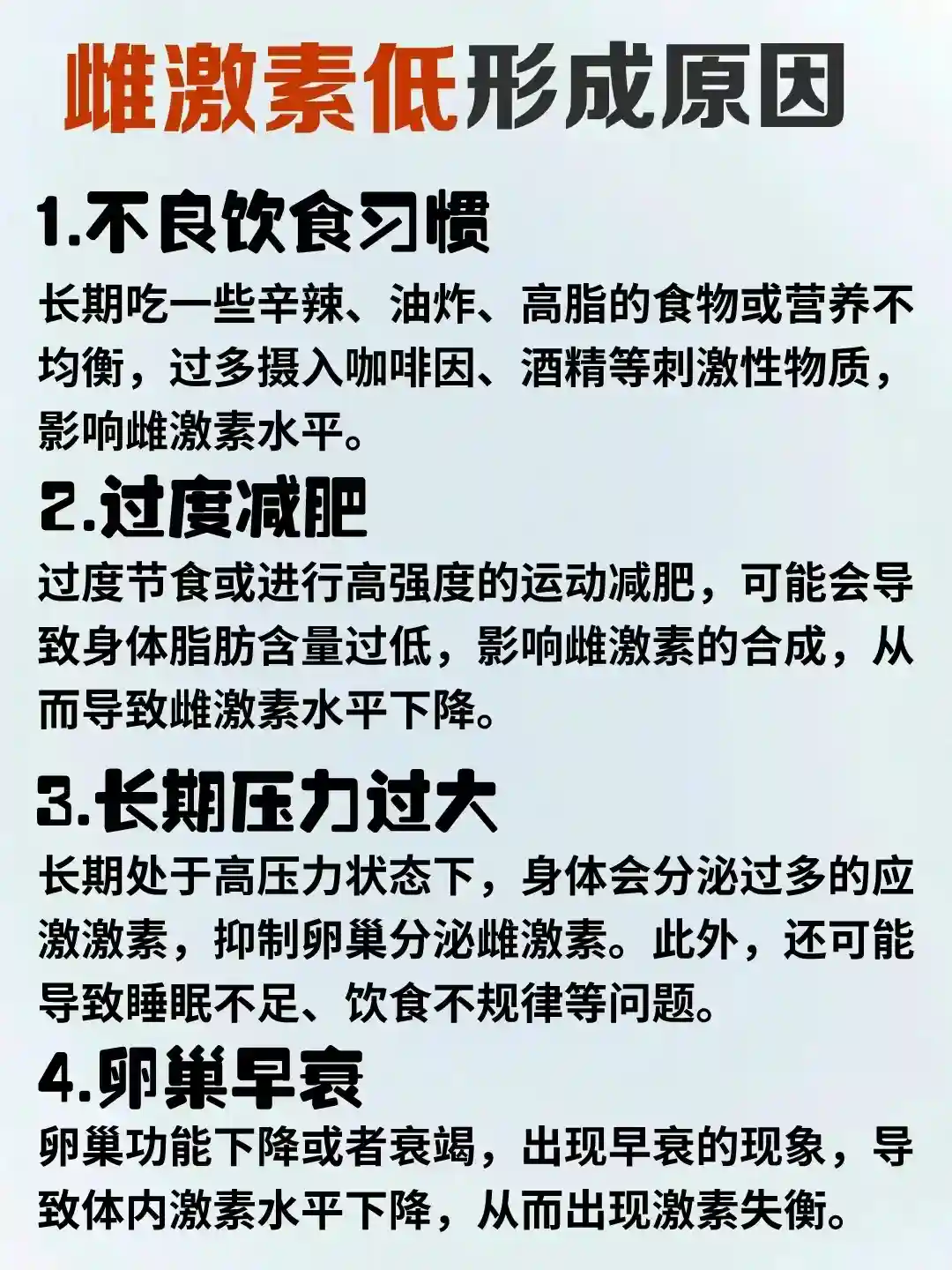 长期吃一些辛辣、油炸、高脂的食物或营养不均衡,过多摄入咖啡因、酒精等刺激性物质, 影响雌激素水平。