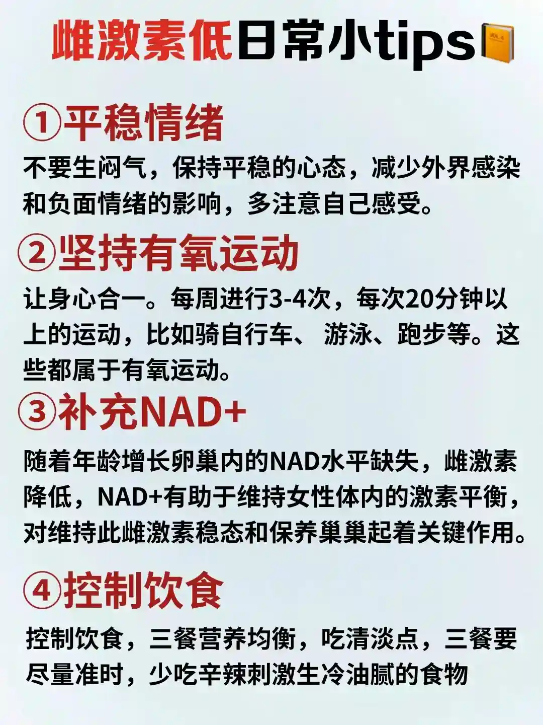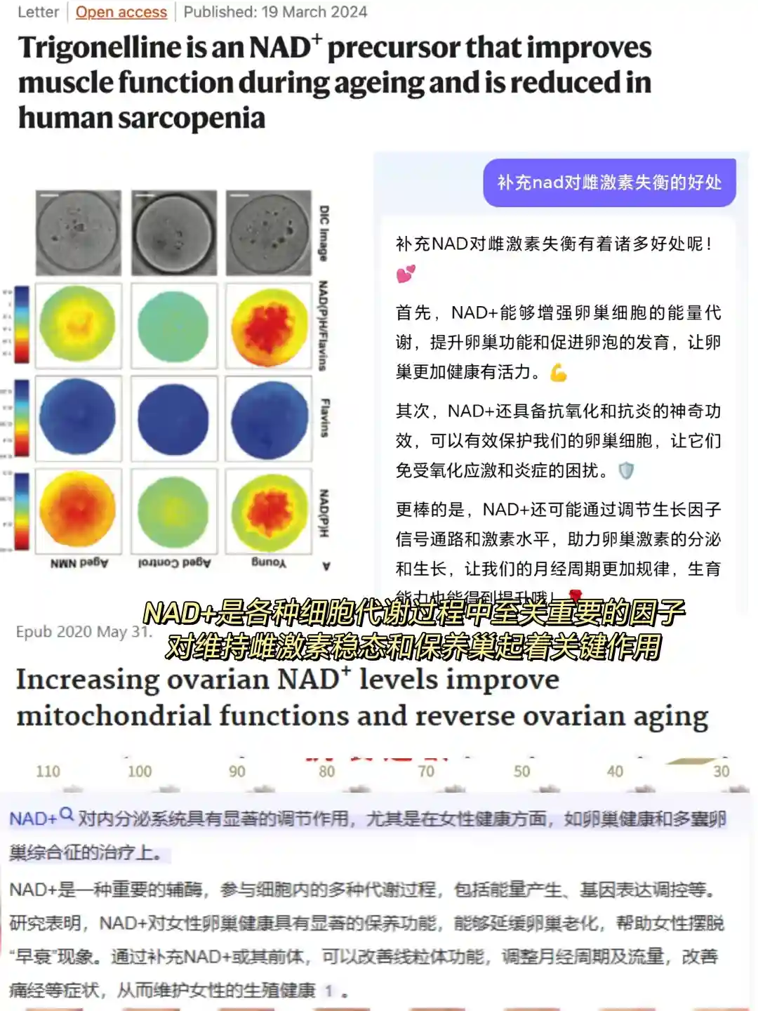 随着年龄增长卵巢内的NAD水平缺失,雌激素降低,NAD+有助于维持女性体内的激素平衡, 对维持此雌激素稳态和保养巢巢起着关键作用。