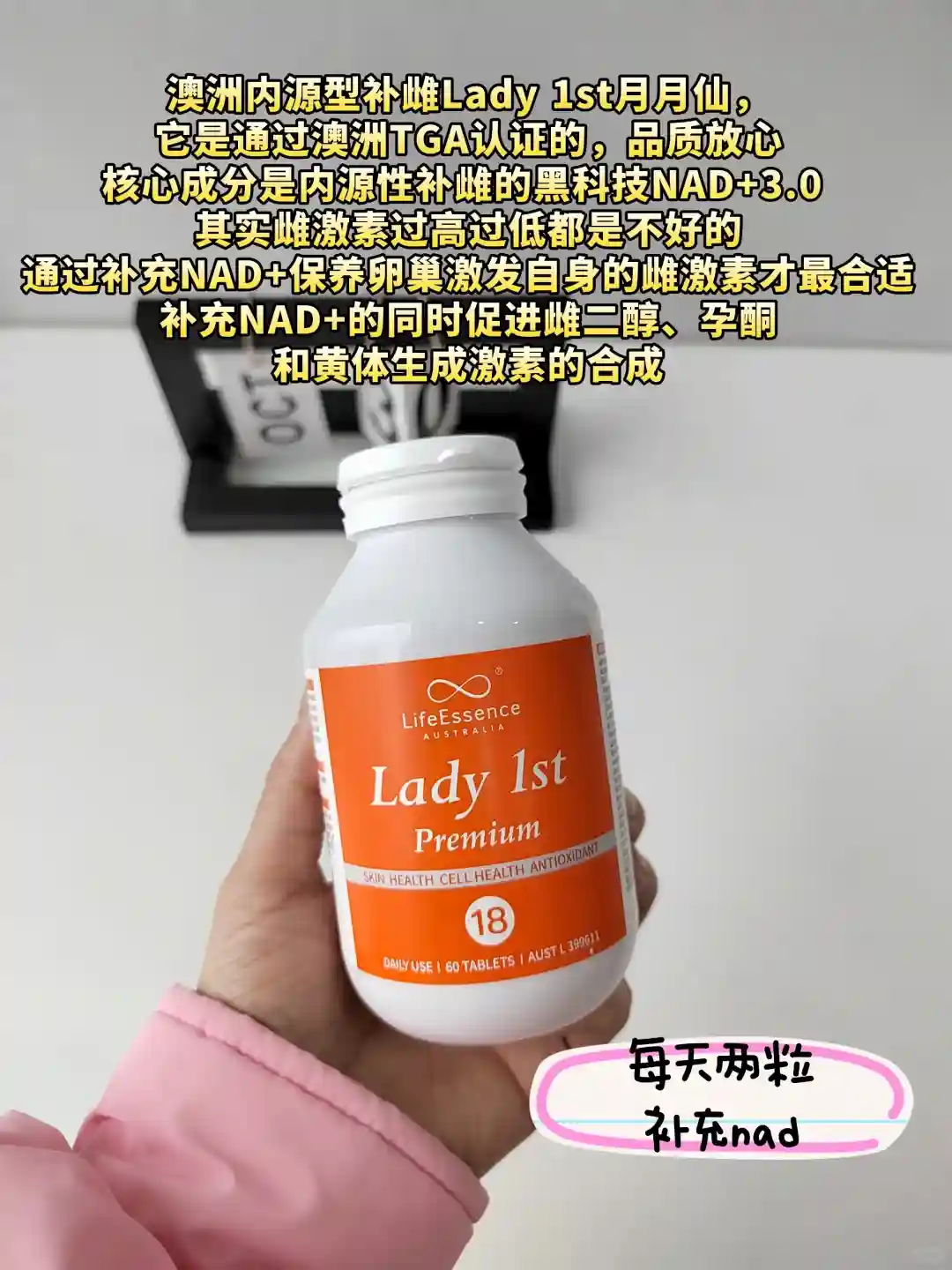 澳洲内源型补雌Lady 1st月月仙,里面的含有澳洲新一代NAD3.0技术,不光如此,里面还含有白藜芦醇、镁、锌、B6、VE等补雌成分,激活雌二醇提升黄体酮,从内提升雌激素水平。