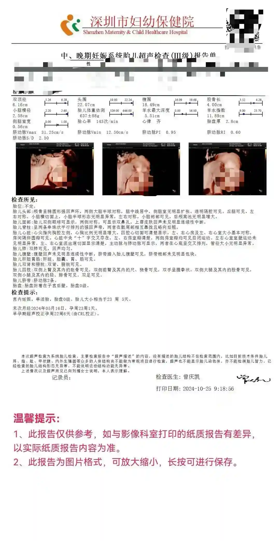 今年3月份突然决定去做的试管,千挑万选看中了深圳中山妇产医院,毕竟首例试管婴儿就是这里成功的,这么多年的经验应该不会差。负责我们的医生是耿蔷主任,跟着她的安排和团队的经验,一路下来挺顺利的,过程当然也挺艰辛的,按照安排用药,按照安排检查,取了9个卵,万幸最后成熟的有8个,受精7个,1-2级有6个,3-4级1个,这个结果当时真的太意外了。在医生建议下全拿去养囊,最后成了4个囊胚1个4AB,1个4AC,1个4BB,1个4BC,最后选择移植4AB,移植后的每一天都很焦虑,会不由自主的想到些不好的事,直到毕业那天看到报告,心里的石头才终于落地了。然后顺利度过整个孕早期,宝宝很乖,妈妈没有孕吐,大排畸宝宝还大了一周,真的很感谢深圳中山妇产医院和耿蔷主任及团队的帮助。最后也希望各位小姐妹都能怀上小崽崽,早日上岸。#试管之路