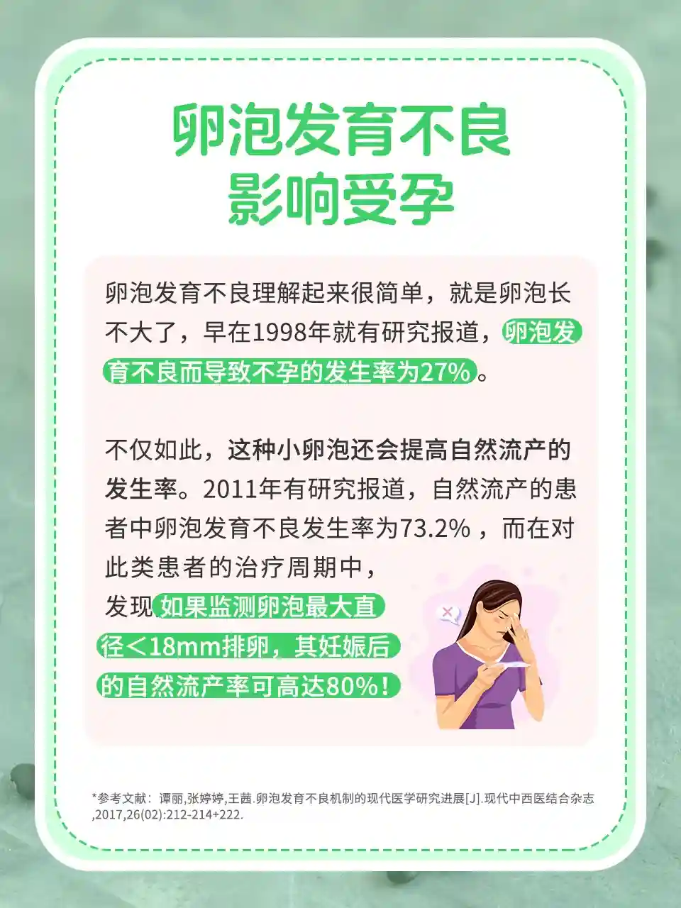 有研究报道,自然流产的患者中卵泡发育不良发生率为73.2% ,而在对此类患者的治疗周期中,发现如果监测卵泡最大直径<18mm排卵,其妊娠后的自然流产率可高达80%!