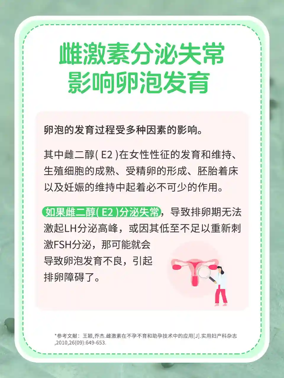 如果雌二醇( E2 )分泌失常,导致排卵期无法激起LH分泌高峰,或因其低至不足以重新刺激FSH分泌,那可能就会导致卵泡发育不良,引起排卵障碍了。