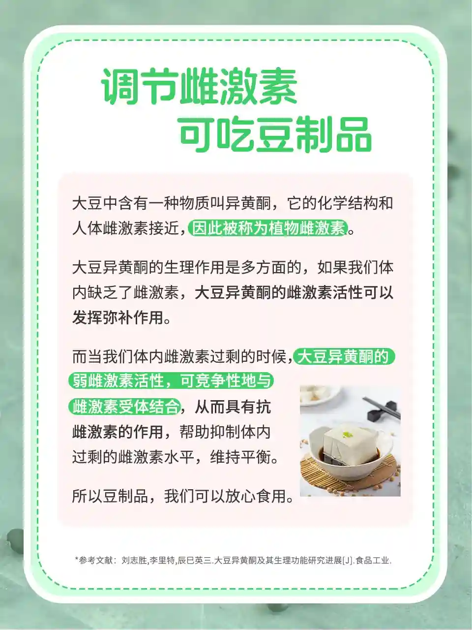 而当我们体内雌激素过剩的时候,大豆异黄酮的弱雌激素活性,可竞争性地与雌激素受体结合,从而具有抗雌激素的作用,帮助抑制体内过剩的雌激素水平,维持平衡。所以豆制品,我们可以放心食用。