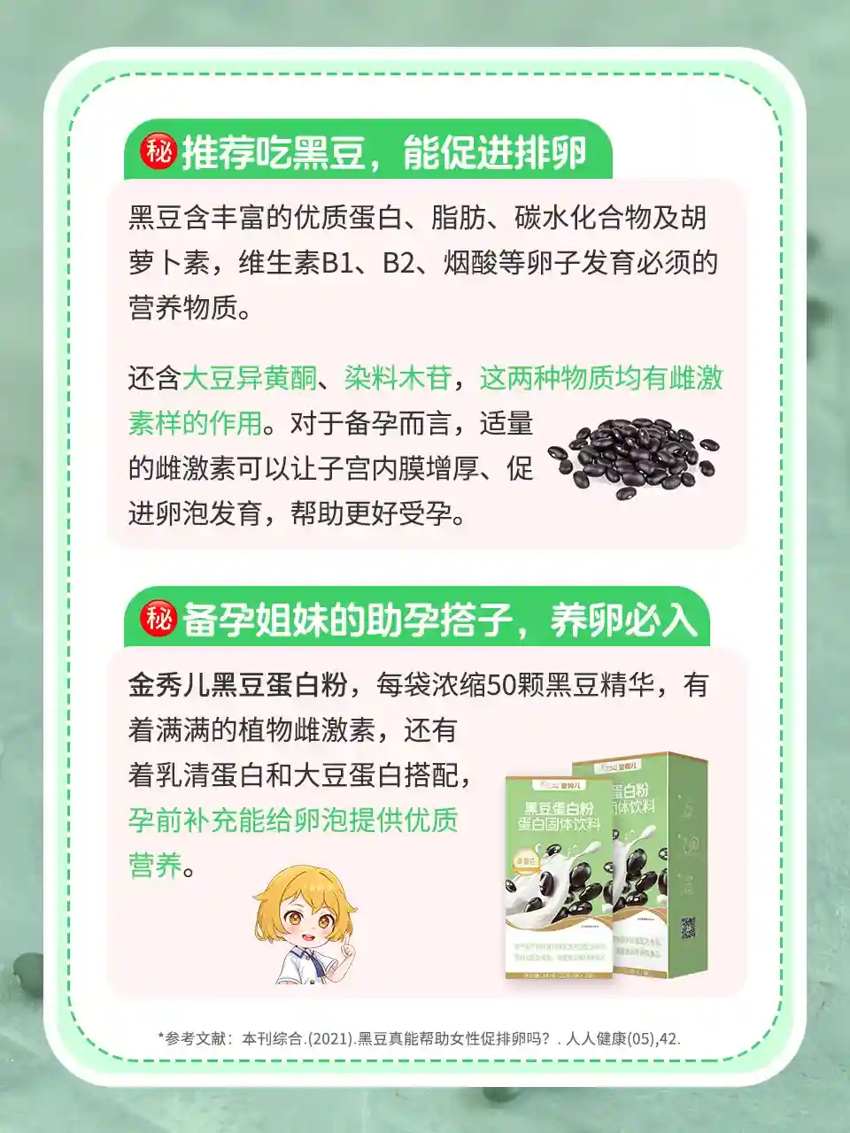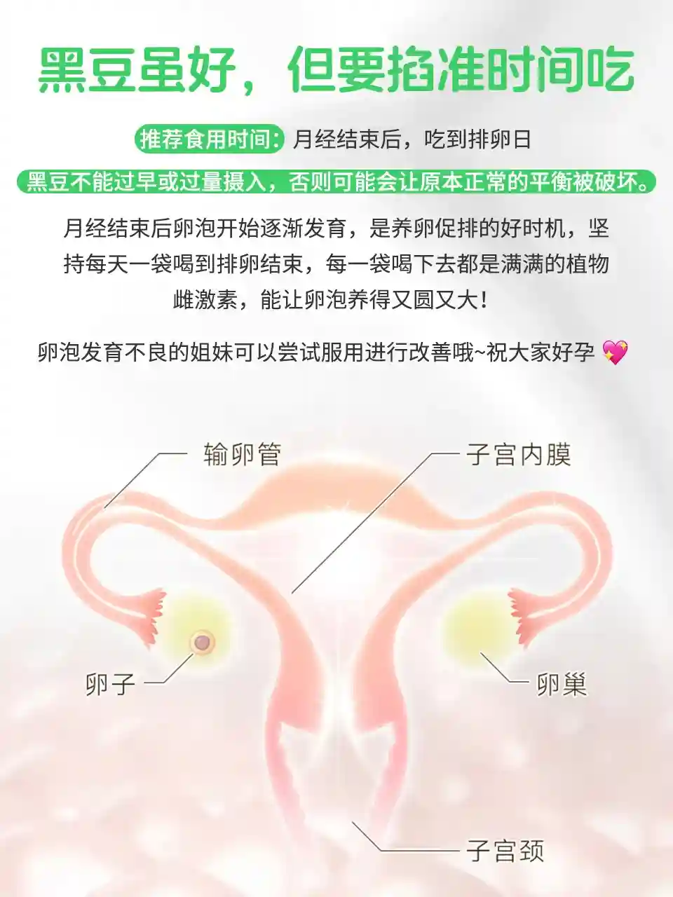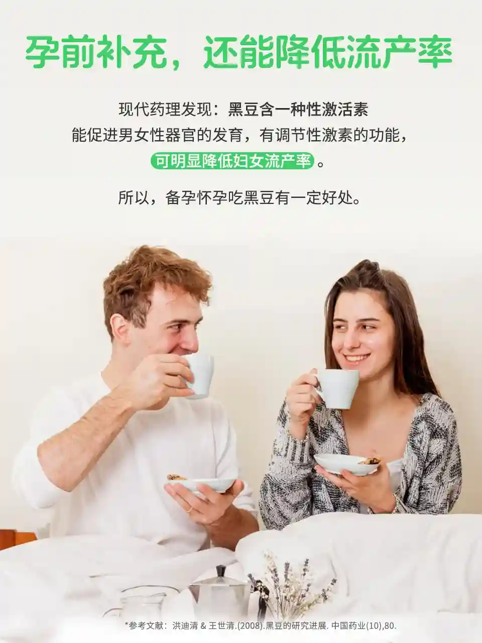 黑豆含富含大豆异黄酮、染料木苷,这两种物质均有雌激素样的作用。对于备孕而言,适量的雌激素可以让子宫内膜增厚、促进卵泡发育,帮助更好受孕。