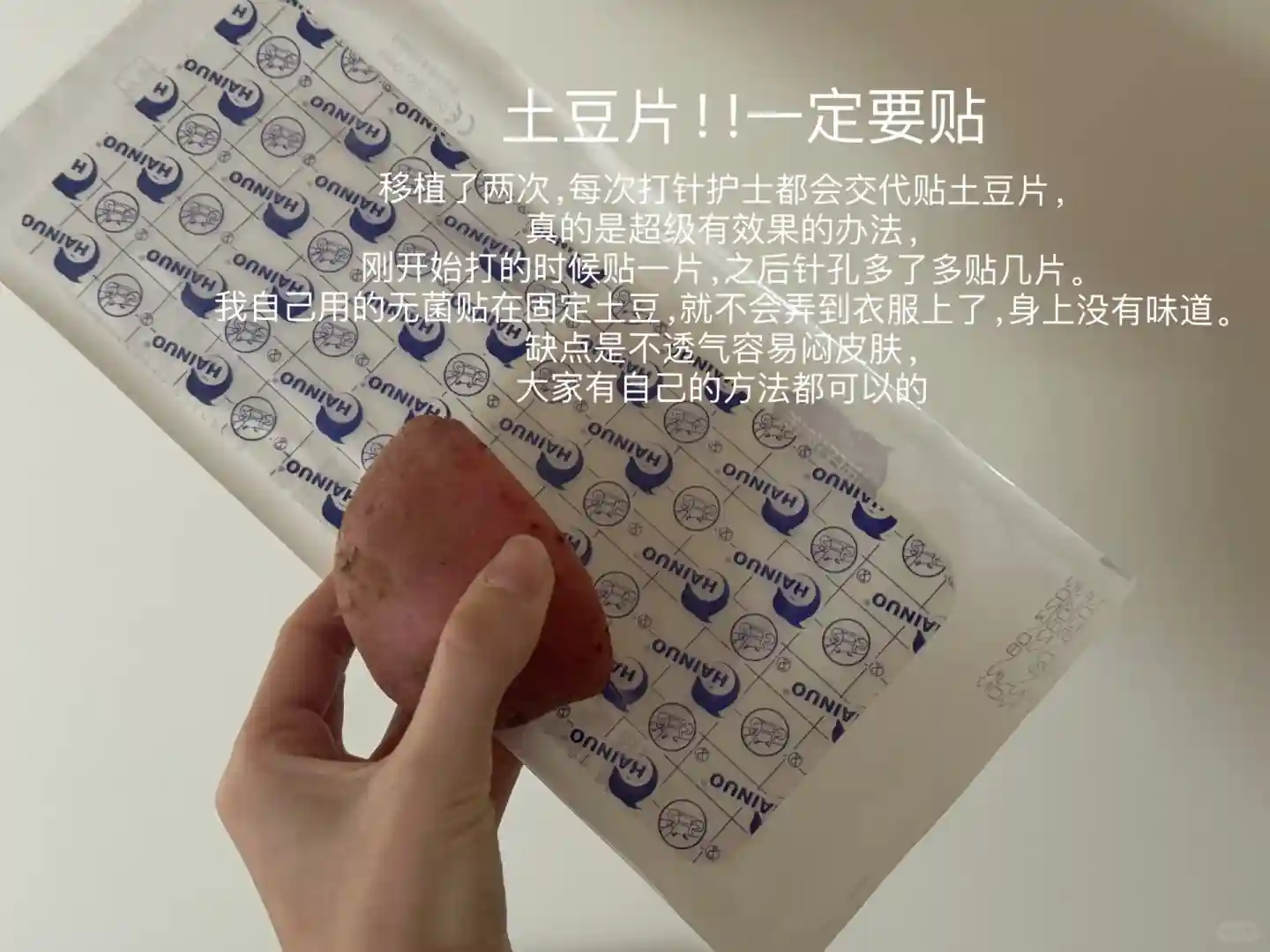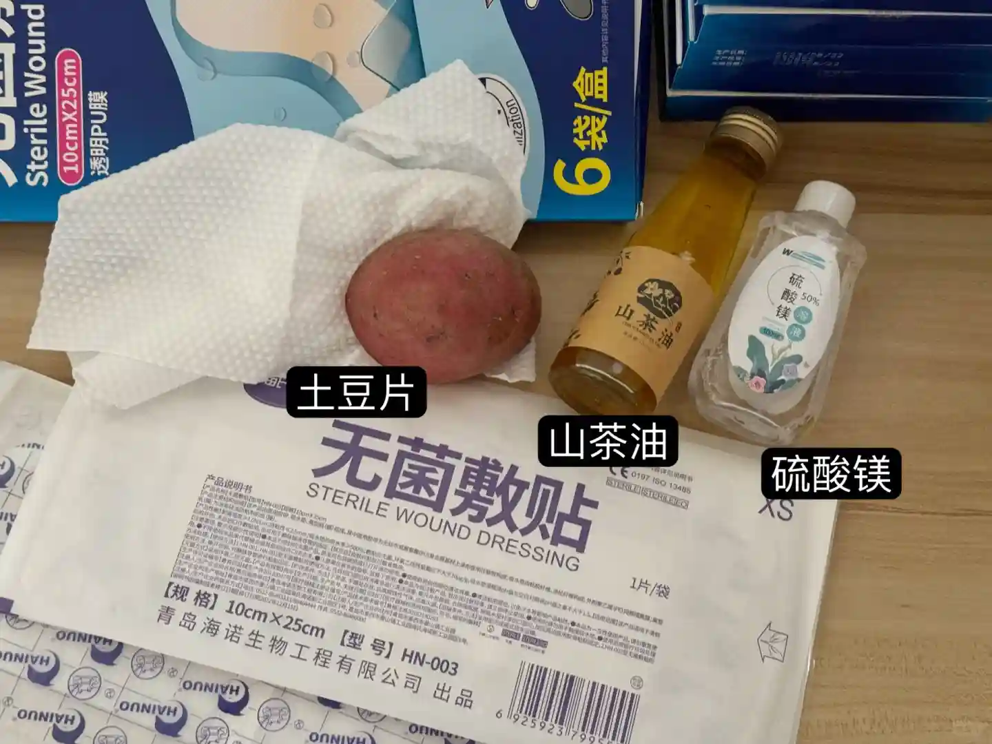 1.最基础的就是土豆片,切薄片每天可以敷一两次,土豆变黑就可以取下或者更换了。我用的是医用无菌贴敷土豆,这样感觉身上不会有味道,缺点是容易闷皮肤,大家可以自己选择,一定要记得每天敷,不要看前期没啥反应就偷懒哦