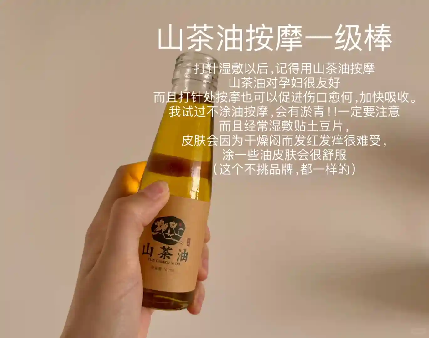 3.按摩的话可以搭配山茶油,山茶油整个孕期使用都是很好的~多按摩可以促进针水吸收,山茶油也可以很好的消肿促进伤口愈合