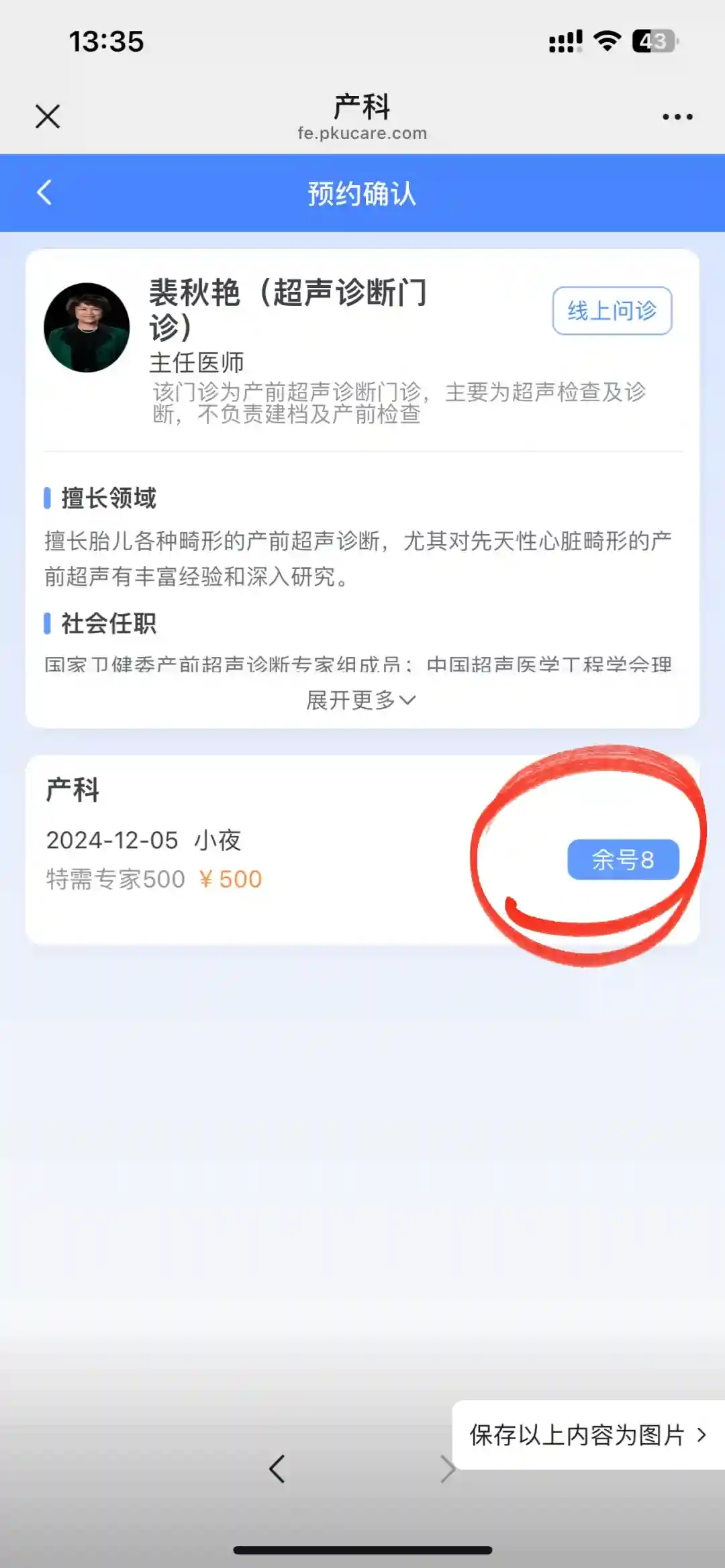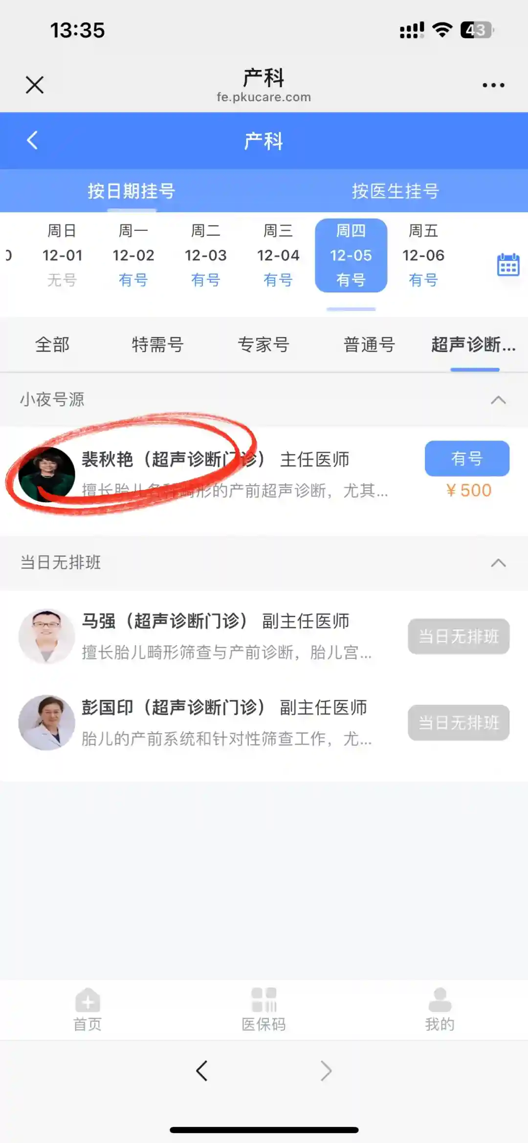 基于“没有花钱的不是”,我在建档医院(北京协和)大排畸通过后,还是挂号了北京知名的专门做大排畸b超的医生,加做了一次检查。这样做的逻辑是“反正就是多花点钱和时间,更放心一点”。挂号操作流程如图,裴秋艳大家可以百度一下。特别知名的b超医生,我挂的北大国际特需号,挂号费500¥,b超280,每周只在这边出诊一个晚上,很多人特意来这边找他看b超的。能挂上号的话,当天去当天就能做上。当时进去一屋子医生从来没见过这种架势,估计都是在旁边学习的吧。