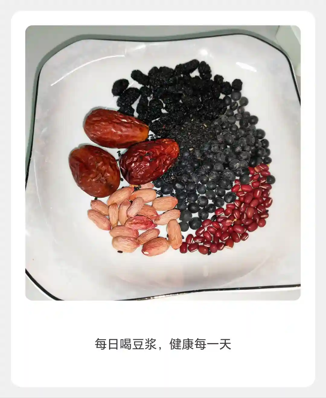 - 把桑椹、黑豆、大枣、花生、黑芝麻一股脑儿放进豆浆机。