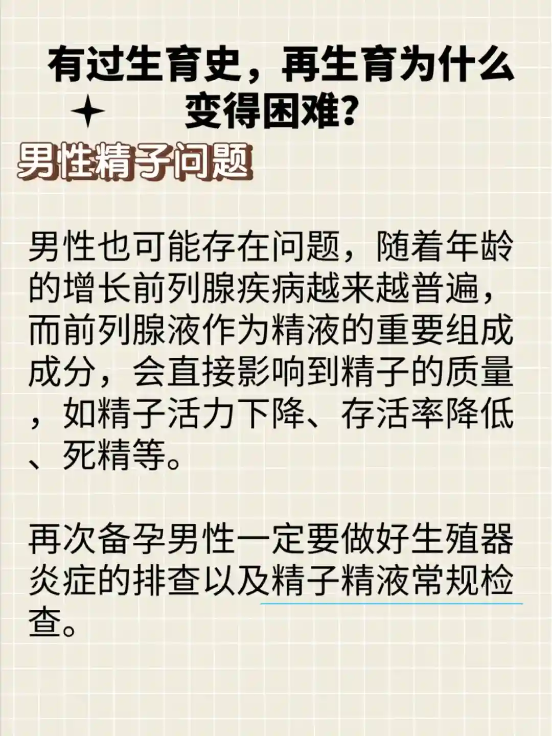 ➡➡再次备孕男性一定要做好生殖器炎症的排查以及精子精液常规检查。
