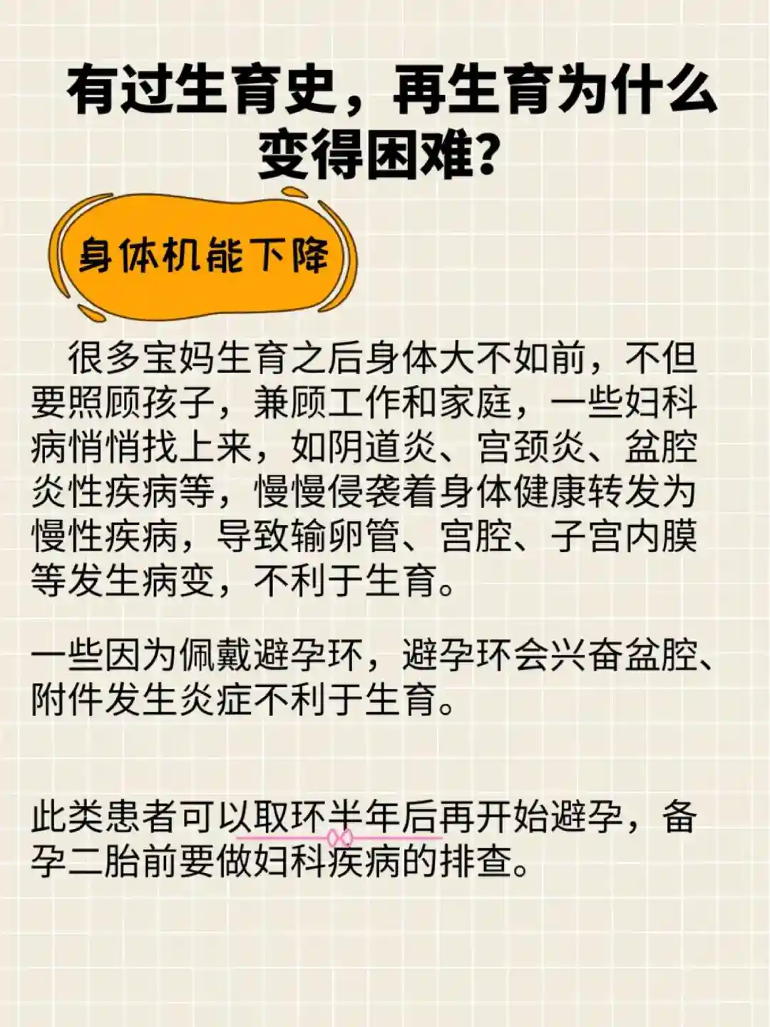 此类患者可以取环半年后再开始避孕,备孕二胎前要做妇科疾病的排查。