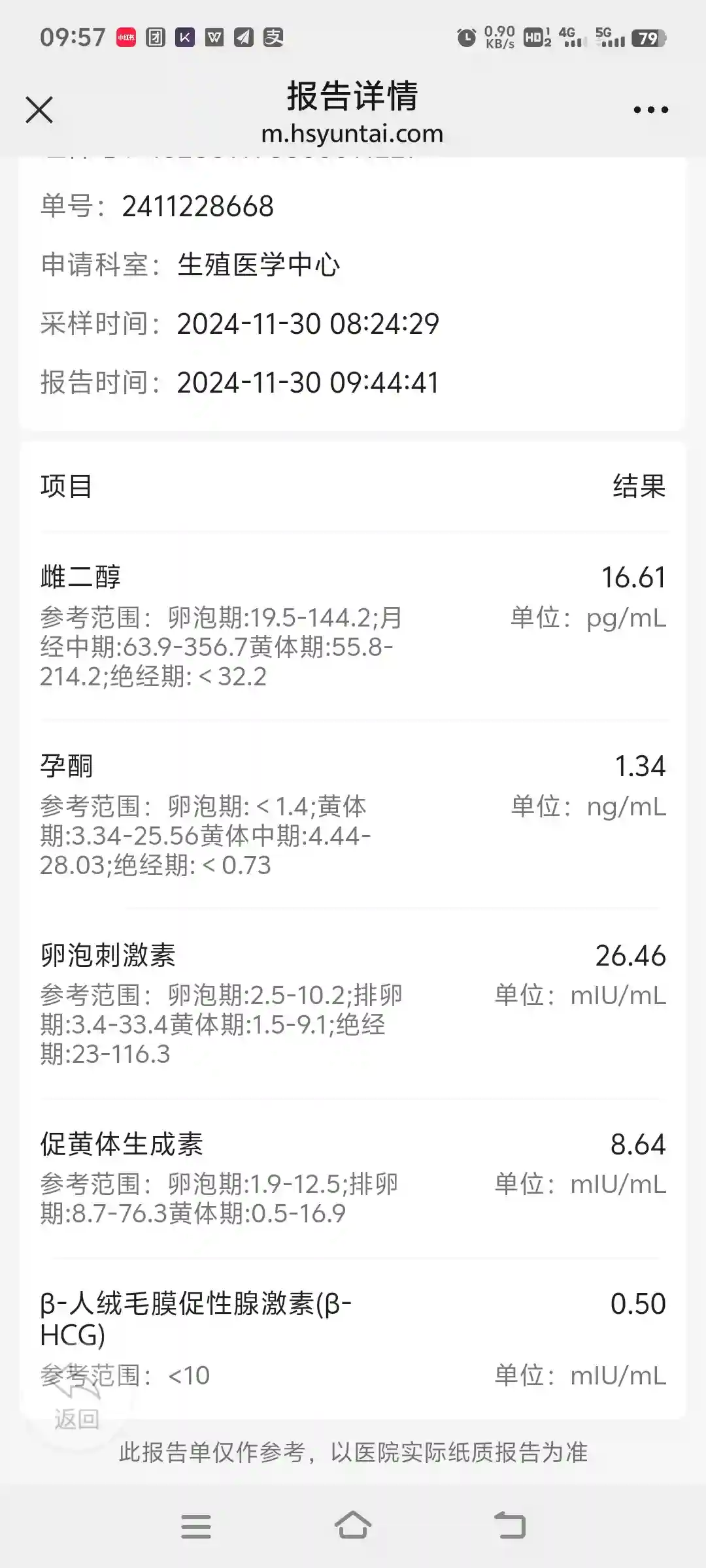 今年10月份,我检测到AMH值小于0.01,比原来还要差许多。面对AMH(抗缪勒管激素)小于0.01且FSH(卵泡刺激素)值偏高的情况,试管姐妹都知道得到一枚胚胎有多难。我在试管过程中遇到一个姐妹,AMH值为0.2取卵6次都没得到一枚胚胎(看别的医生)。我AMH值低于0.01ng/ml卵巢储备功能极低,不是每个月都会有卵泡。FSH值偏高表明卵巢功能衰退,11月30日,我检测FSH值为26.46。当时超声双侧卵巢都没看到卵泡,立马心里就开始凉凉,感觉这周期取卵又无望了。