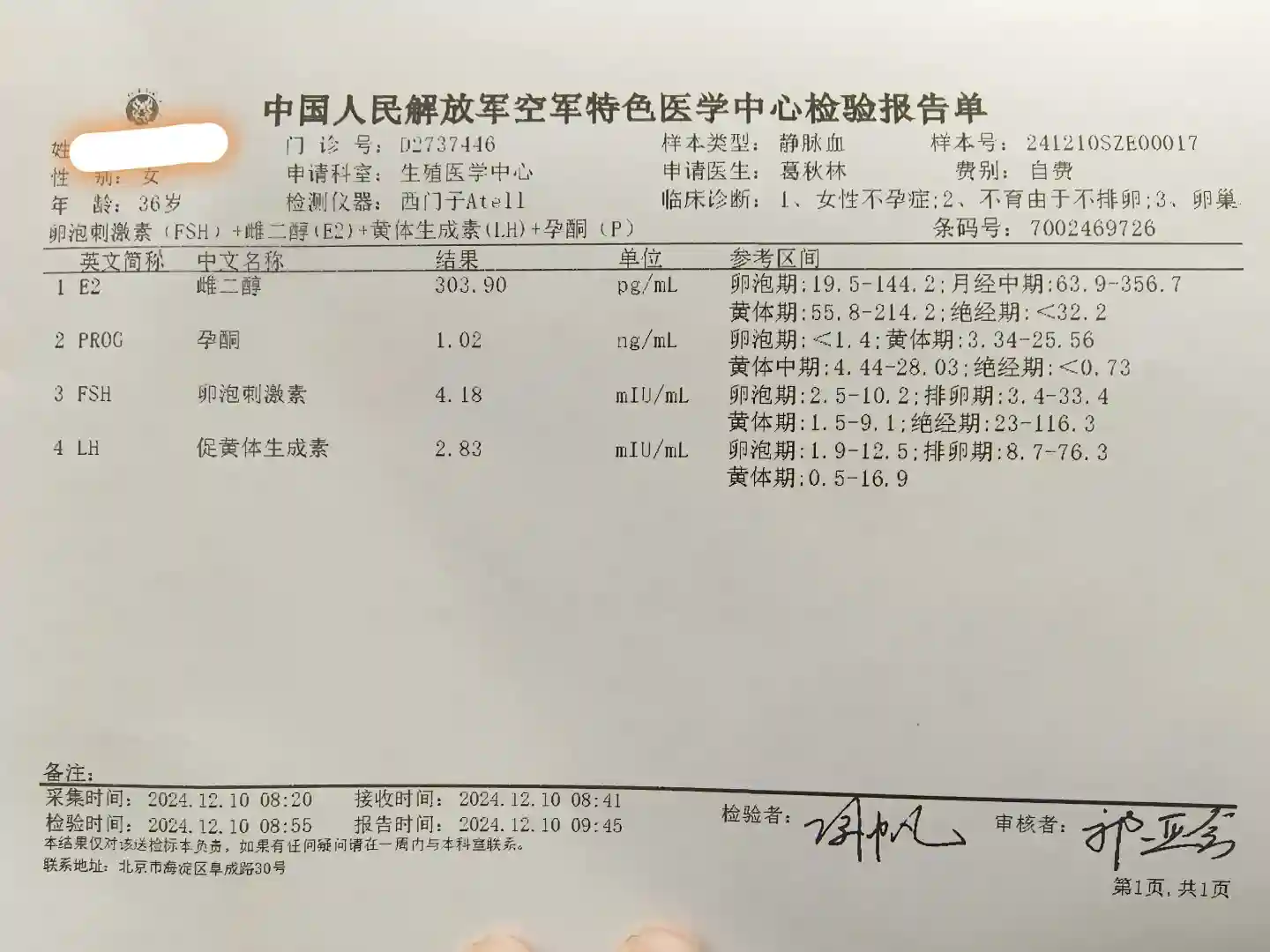 但是我在空总的医生(葛秋林医生),让我不要放弃,试试看,她给开了5天的口服药,12月6日复诊数值下降,B超还监测到了卵泡!!!简直就是惊喜!!我开始进入促排卵阶段。每天我只打半只思则凯这么少的用量我也是第一次!12月12日,成功取卵,12月16日看胚胎的那天我迟迟没有勇气迈出家门。葛医生催促我看胚胎,到了医院得知9细胞一级胚胎。简直就是命运再次眷顾了我,又一次惊喜!!