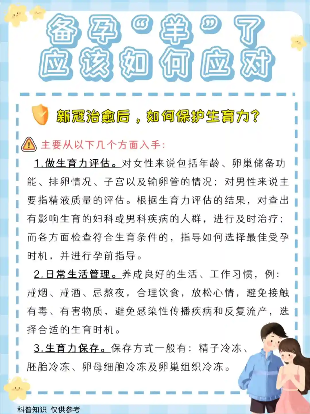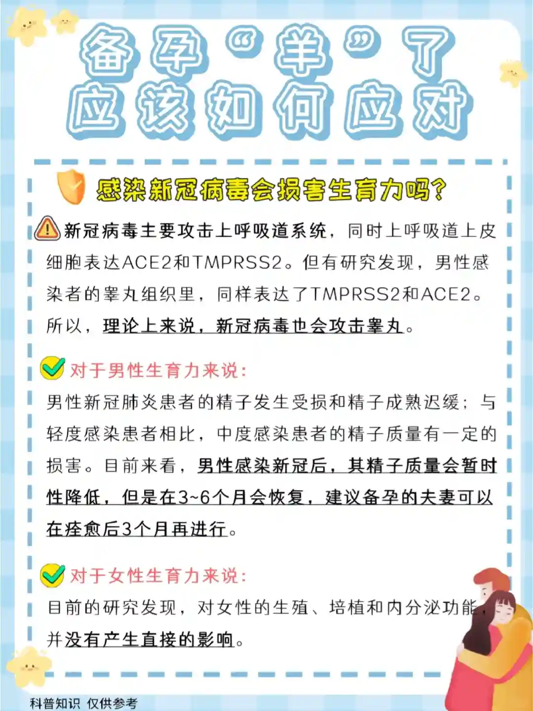 男性新冠肺炎患者的精子发生受损和精子成熟迟缓;与轻度感染患者相比,中度感染患者的精子质量有一定的损害。目前来看,男性感染新冠后,其精子质量会暂时性降低,但是在3~6个月会恢复,建议备孕的夫妻可以在痊愈后3个月再进行。