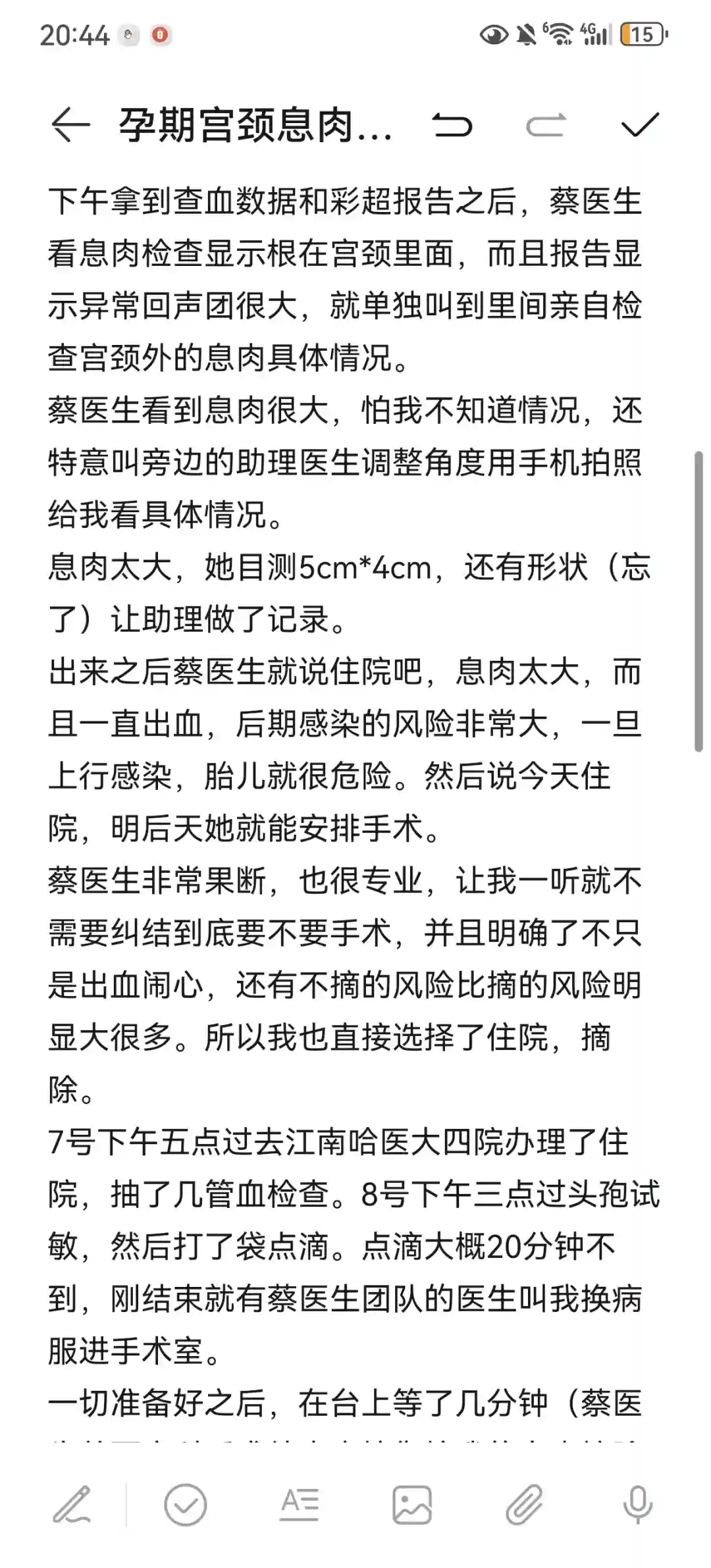 2️⃣讲讲过程: 挂的蔡医生江北7号的专家号,上午10点去的,拿了之前所有的产检记录和报告,会有产科助理医生问清楚基本情况做好记录,进去之后蔡医生知道宫颈息肉后开了经阴经腹联合检查,要知道息肉的根在哪里。下午蔡医生看了报告,就单独叫到里间亲自检查宫颈外的息肉具体情况。怕我不知道情况,还特意叫旁边的助理医生调整角度用手机拍照给我看具体情况。出来之后蔡医生就说住院,息肉太大,而且一直出血,后期感染的风险非常大,一旦上行感染,胎儿就很危险。然后说今天住院,明后天她就能安排手术。