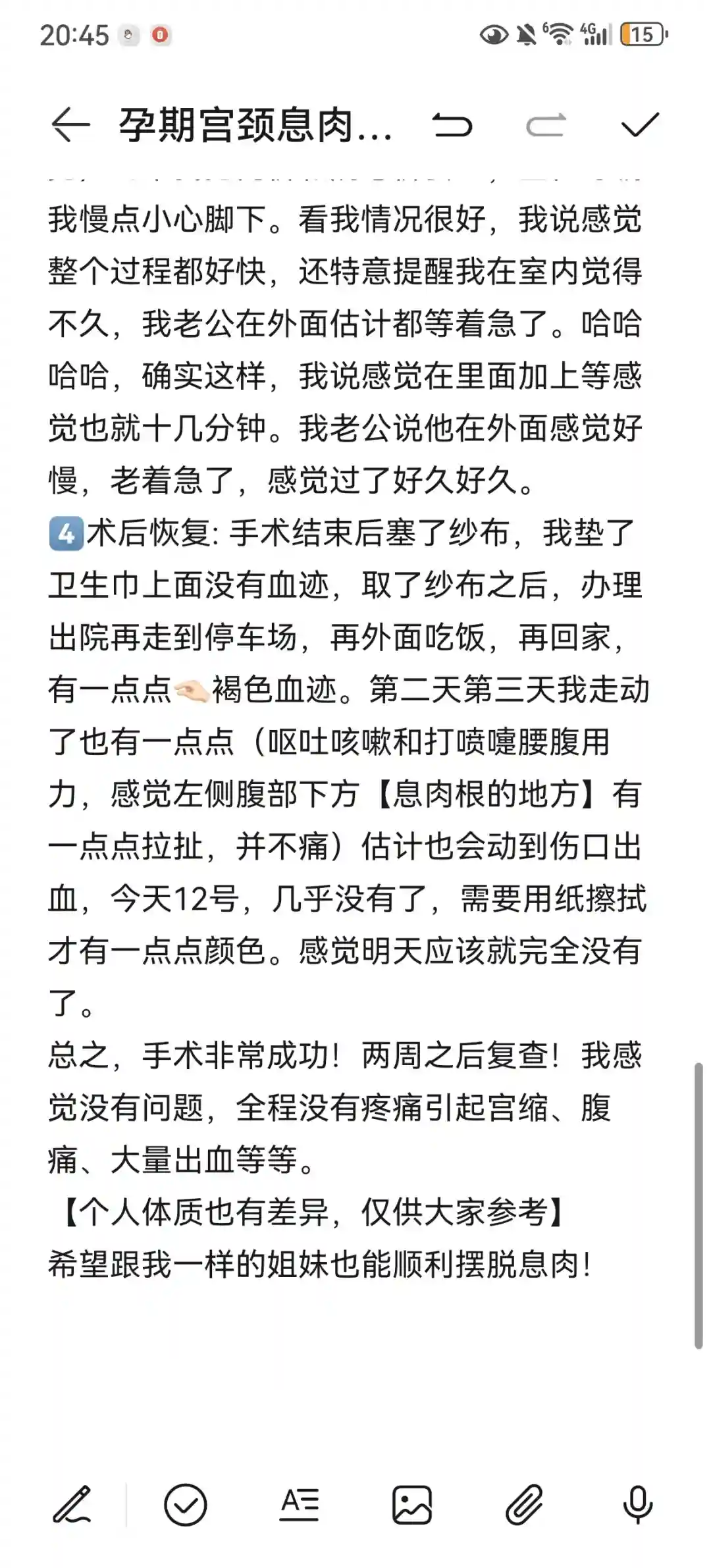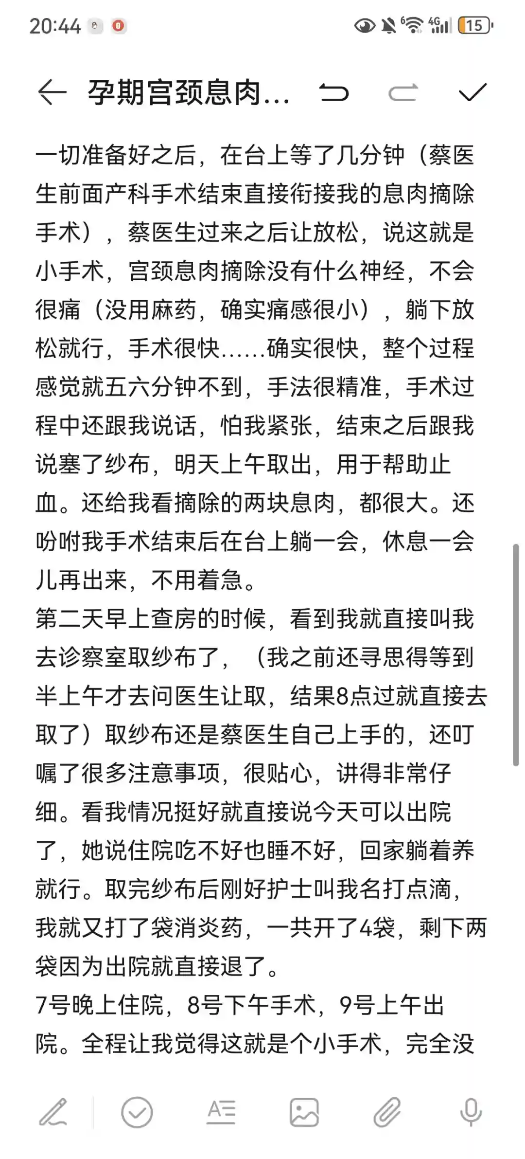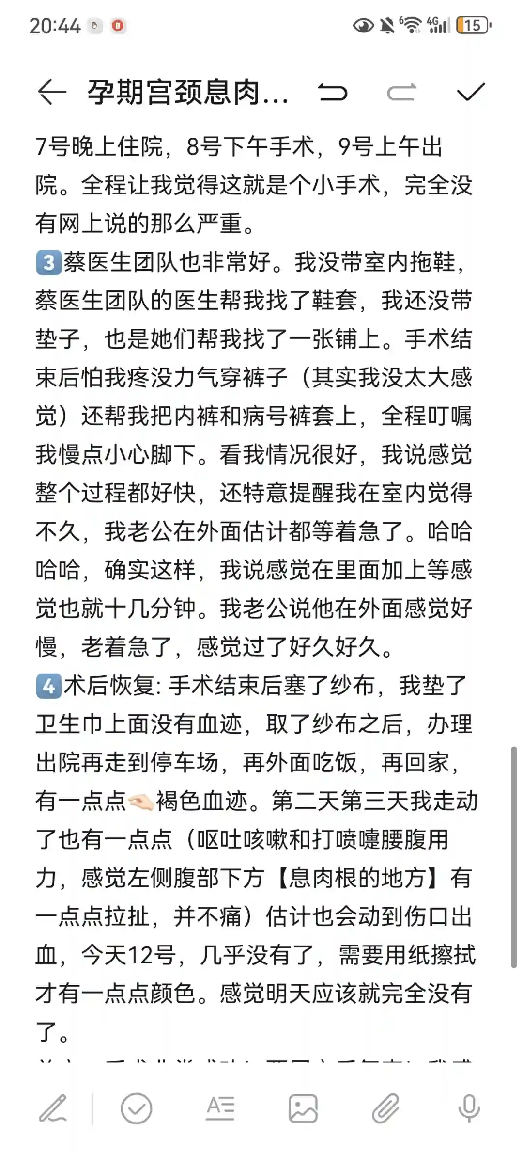 7号晚上住院,8号下午手术,9号上午出院。全程让我觉得这就是个小手术,完全没有网上说的那么严重。总之,手术非常成功!两周之后复查!我感觉没有问题,全程没有疼痛引起宫缩、腹痛、大量出血等等。【个人体质也有差异,仅供大家参考】#孕期 #孕期宫颈息肉