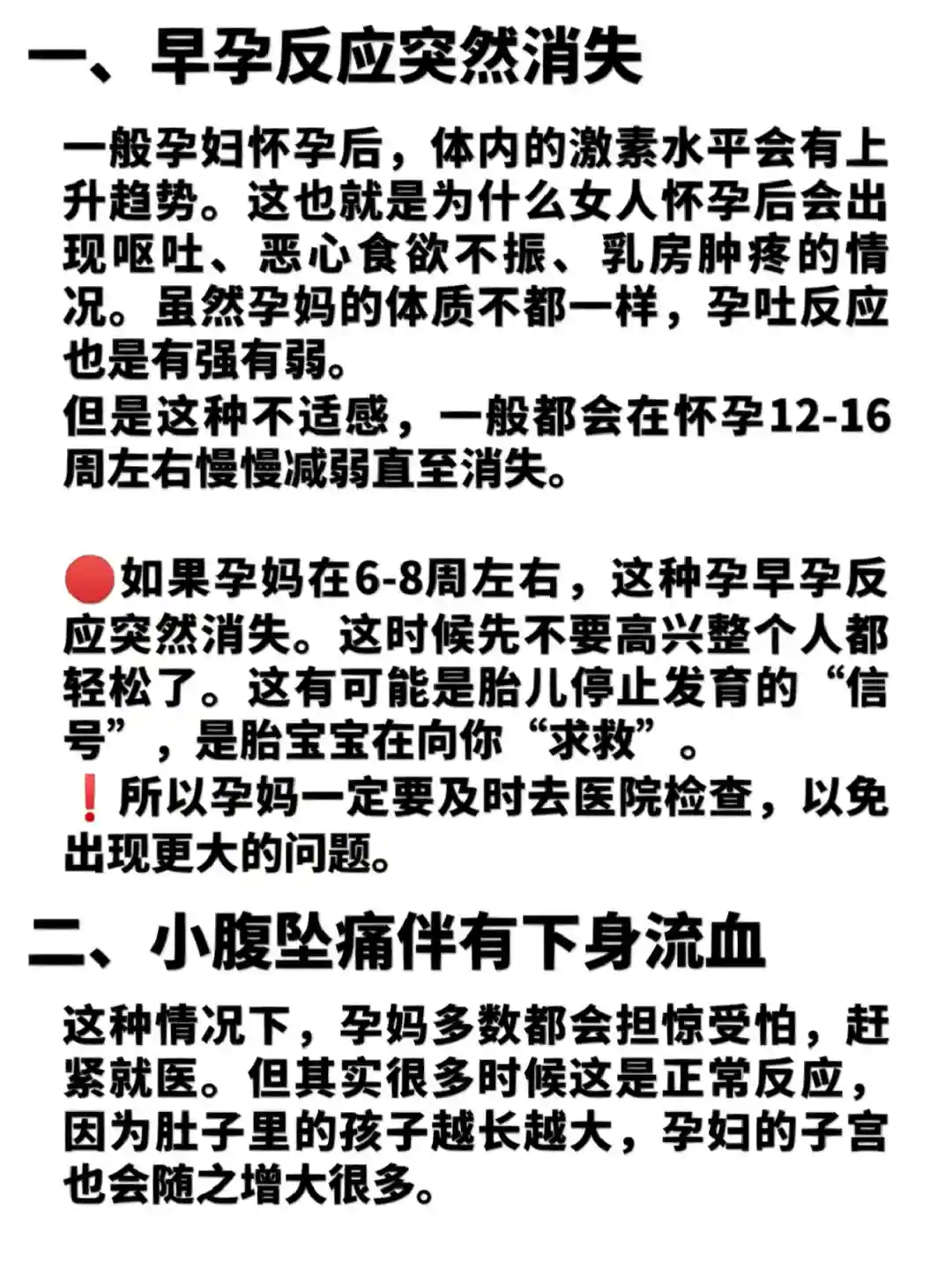 🔴如果孕妈在6-8周左右,这种孕早孕反应突然消失。这时候先不要高兴整个人都轻松了。这有可能是胎儿停止发育的“信号”,是胎宝宝在向你“求救”。