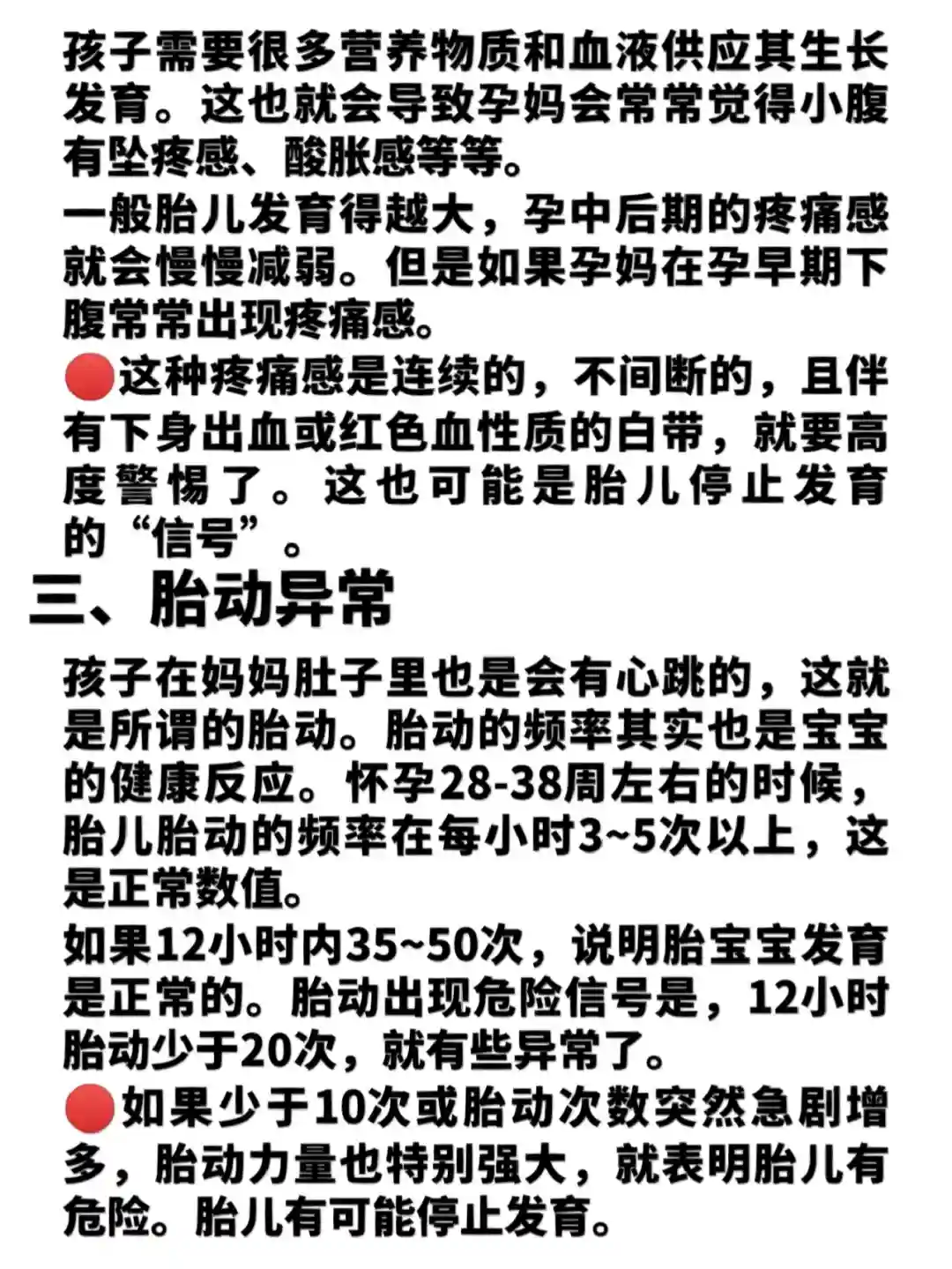 🔴这种疼痛感是连续的,不间断的,且伴有下身出血或红色血性质的白带,就要高度警惕了。这也可能是胎儿停止发育的“信号”。