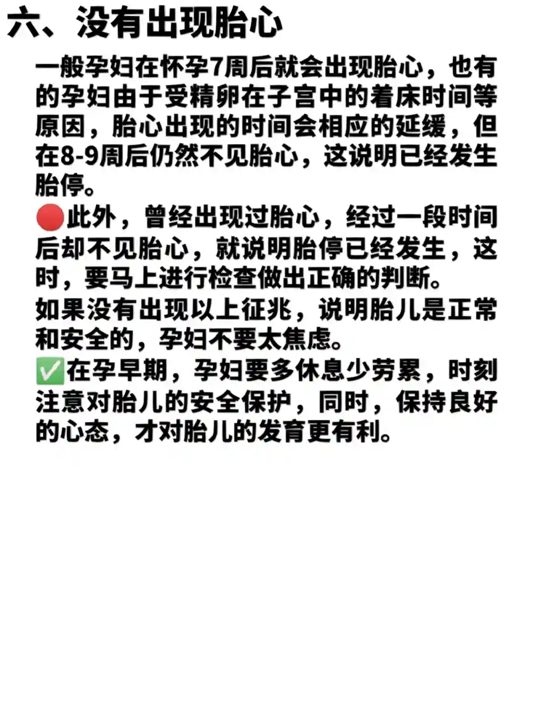 🔴此外,曾经出现过胎心,经过一段时间后却不见胎心,就说明胎停已经发生,这时,要马上进行检查做出正确的判断。