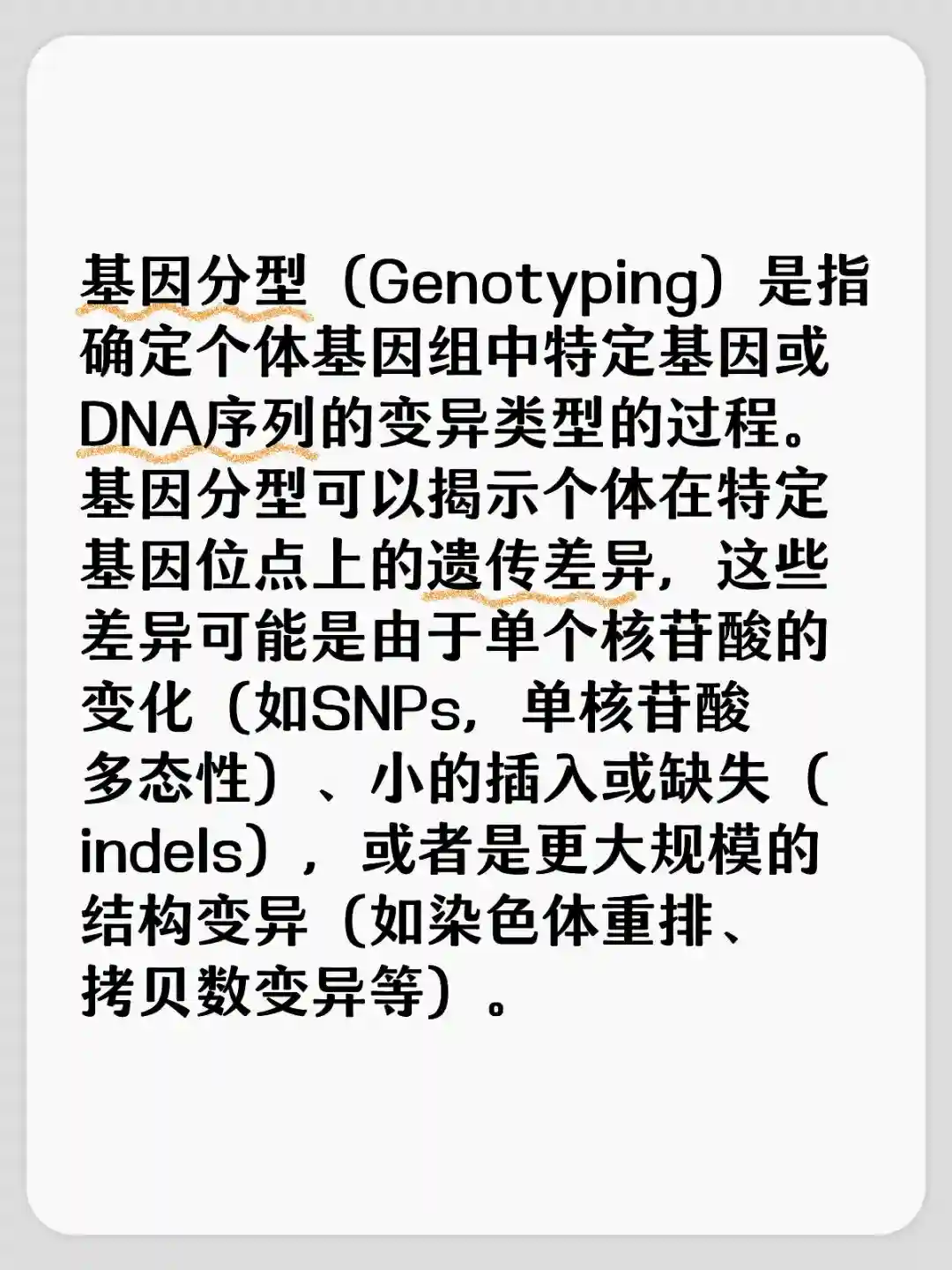 基因分型可以揭示个体在特定基因位点上的遗传差异,这些差异可能是由于单个核苷酸的变化(如SNPs,单核苷酸多态性)、小的插入或缺失(indels),或者是更大规模的结构变异(如染色体重排、拷贝数变异等)。