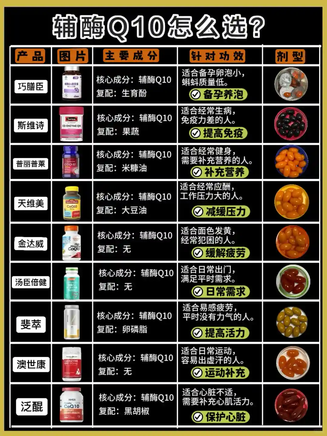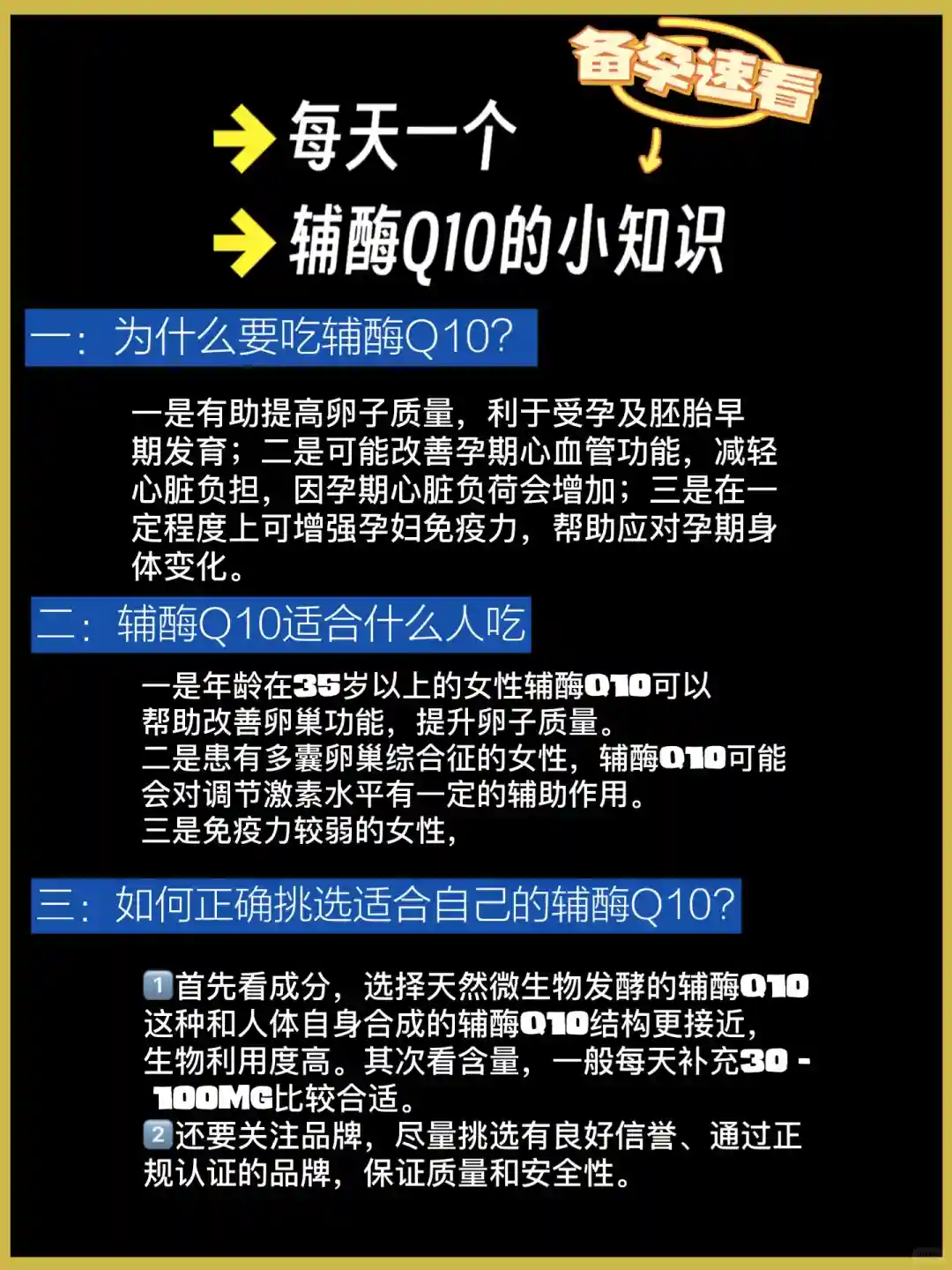 不过呢,辅酶Q10也有一些注意事项。它有胶囊、片剂等剂型,一般建议饭后服用,每天30-60毫克,具体要遵医嘱。而且可能会有胃部不适、恶心、皮疹等轻微副作用。同时,正在服用降糖药、抗凝血药等药物的人群,使用辅酶Q10前要先咨询医生,避免相互作用 。总之,备孕时是否需要补充辅酶Q10,以及具体的用法用量,一定要先咨询医生哦。#备孕攻略#多囊 #多囊备孕 #amh #备孕期间怎么调理身体#大龄备孕 #高龄备孕#备孕需要准备什么