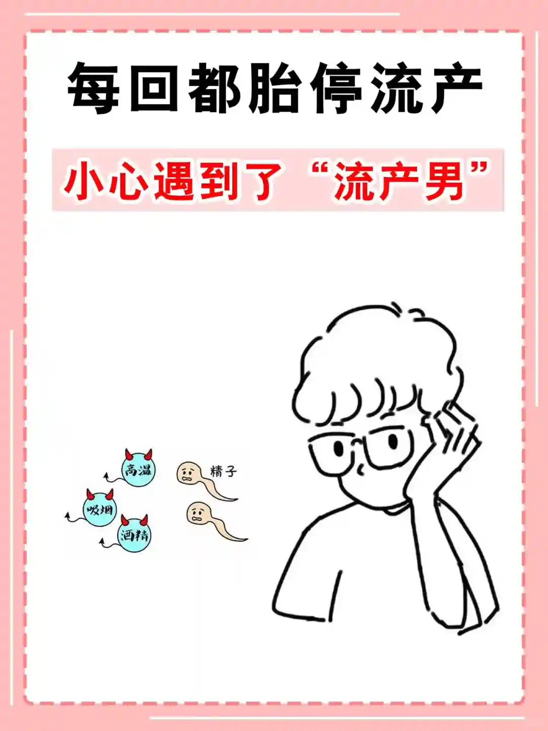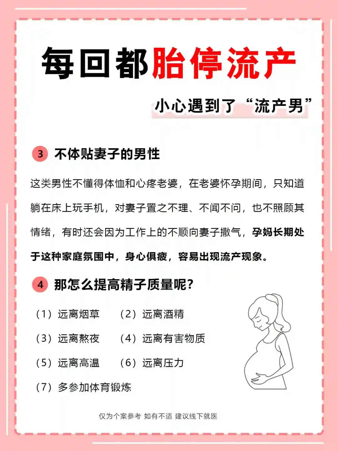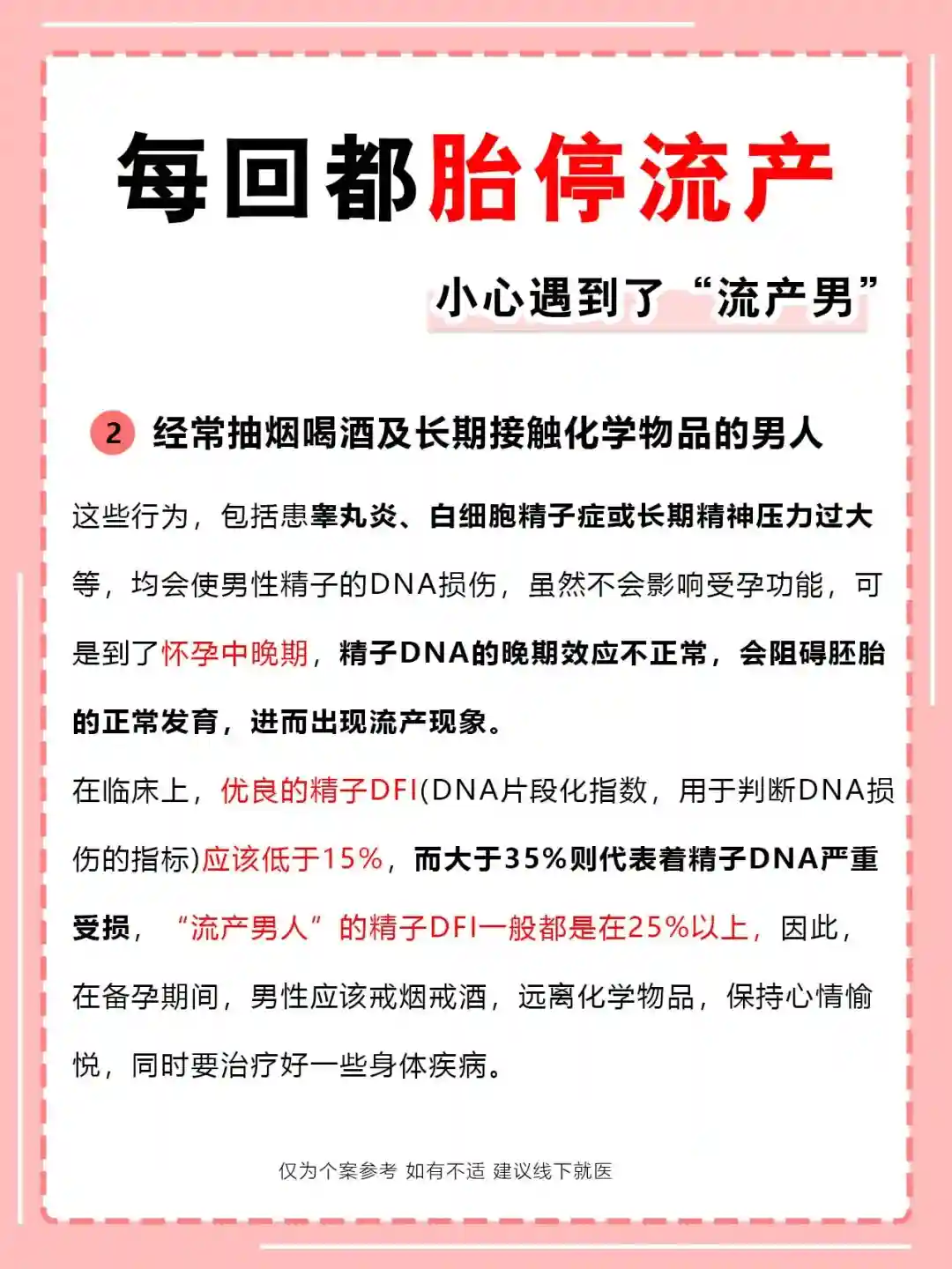 这些行为,包括患睾丸炎、白细胞精子症或长期精神压力过大等,均会使男性精子的DNA损伤,虽然不会影响受孕功能,可是到了怀孕中晚期,精子DNA的晚期效应不正常,会阻碍胚胎的正常发育,进而出现流产现象。