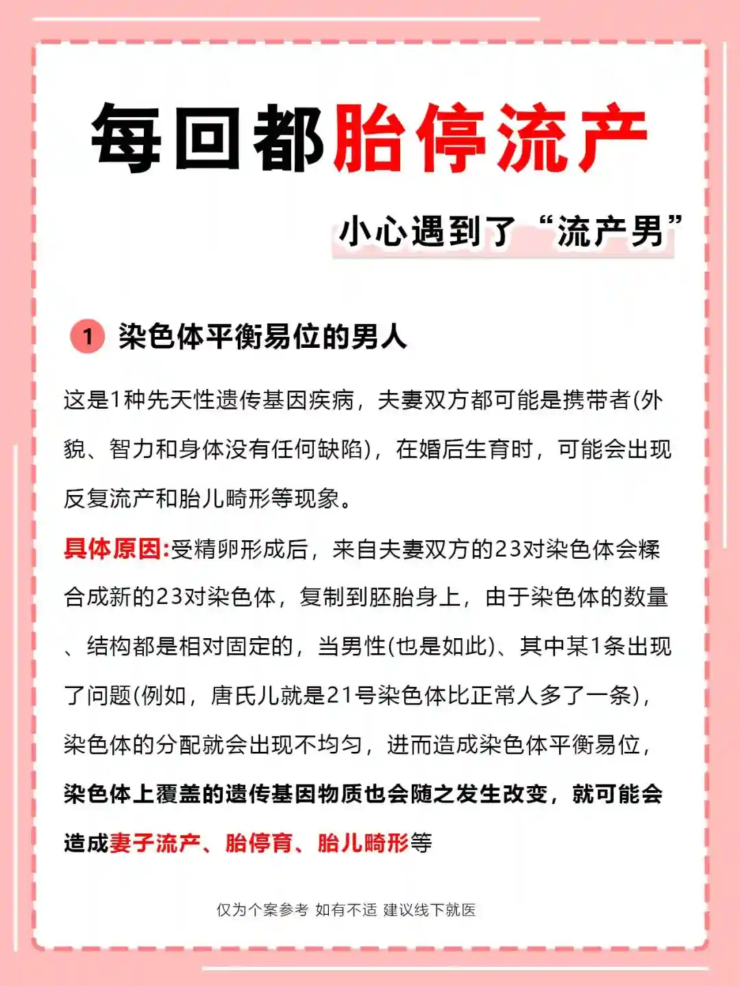 具体原因:受精卵形成后,来自夫妻双方的23对染色体会糅合成新的23对染色体,复制到胚胎身上,由于染色体的数量、结构都是相对固定的,当男性(也是如此)、其中某1条出现了问题(例如,唐氏儿就是21号染色体比正常人多了一条),染色体的分配就会出现不均匀,进而造成染色体平衡易位,染色体上覆盖的遗传基因物质也会随之发生改变,就可能会造成妻子流产、胎停育、胎儿畸形等