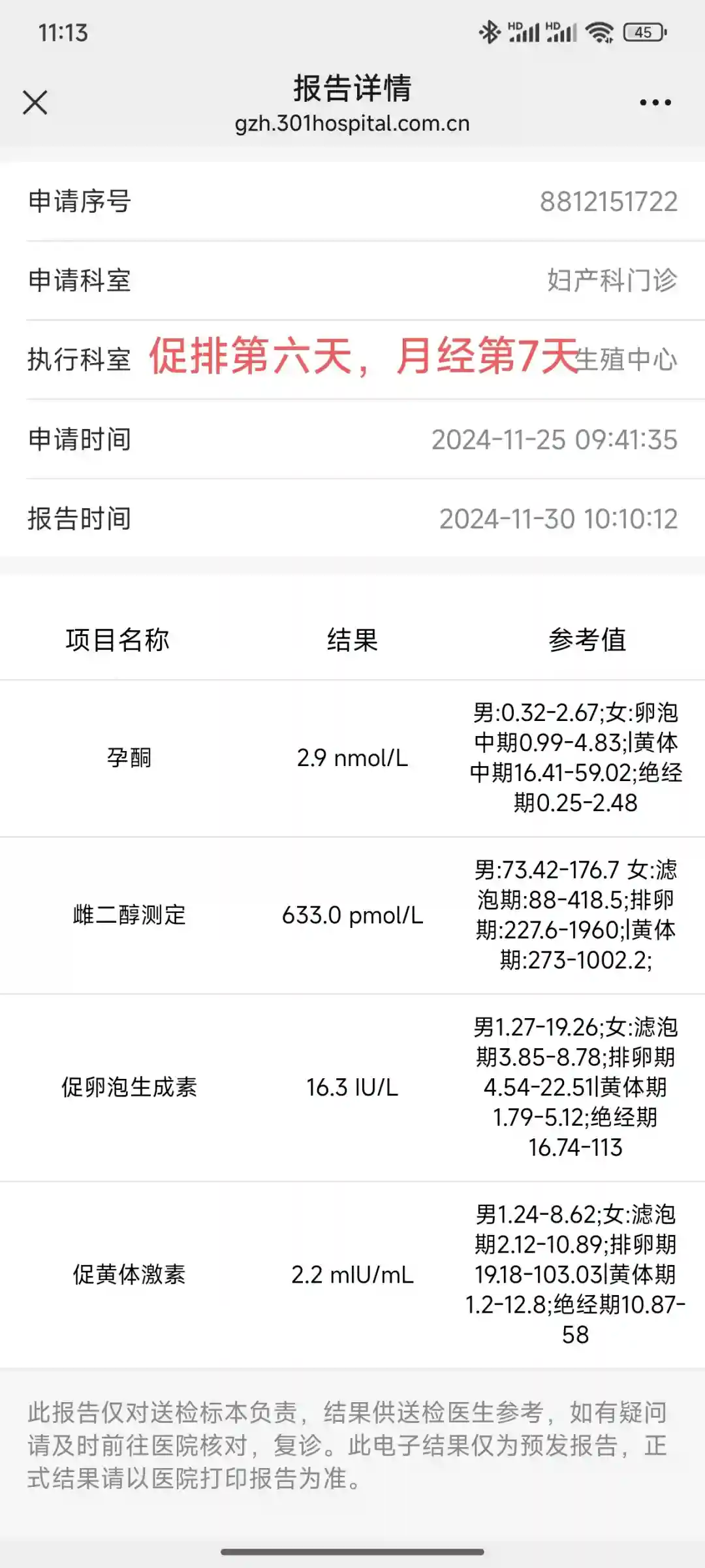 11月30日,促排第六天,今天杨主任,内膜0.6,卵泡不均匀,右侧两个1.5和1.3,左侧三个都是0.9上下,主任让在打两天,看看情况,今天加上了西曲瑞克防排药,今天不用等血值,据听说已经连续好几天做完b超就可以拿药走人了,血值出来雌二醇好低。