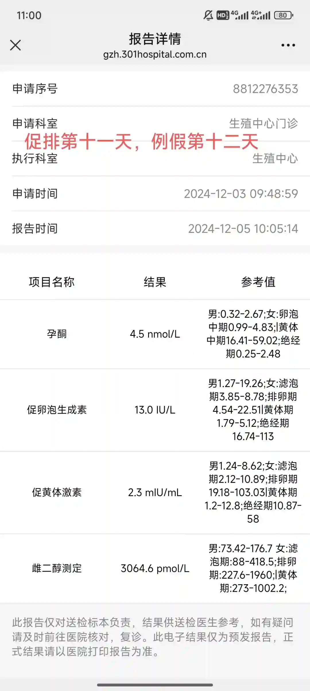费用,10+2248.86=2258.8612月5日,促排第十一天,今天还是彭主任,发现这次彭出诊比较多,内膜0.8,左侧卵泡4个,右侧卵泡3个,卵泡在1.4-2.2之间,今天下午夜针,明天一早还得抽血,吃药,周六移植。但由于周六输血科不上班,不能卵巢灌注了