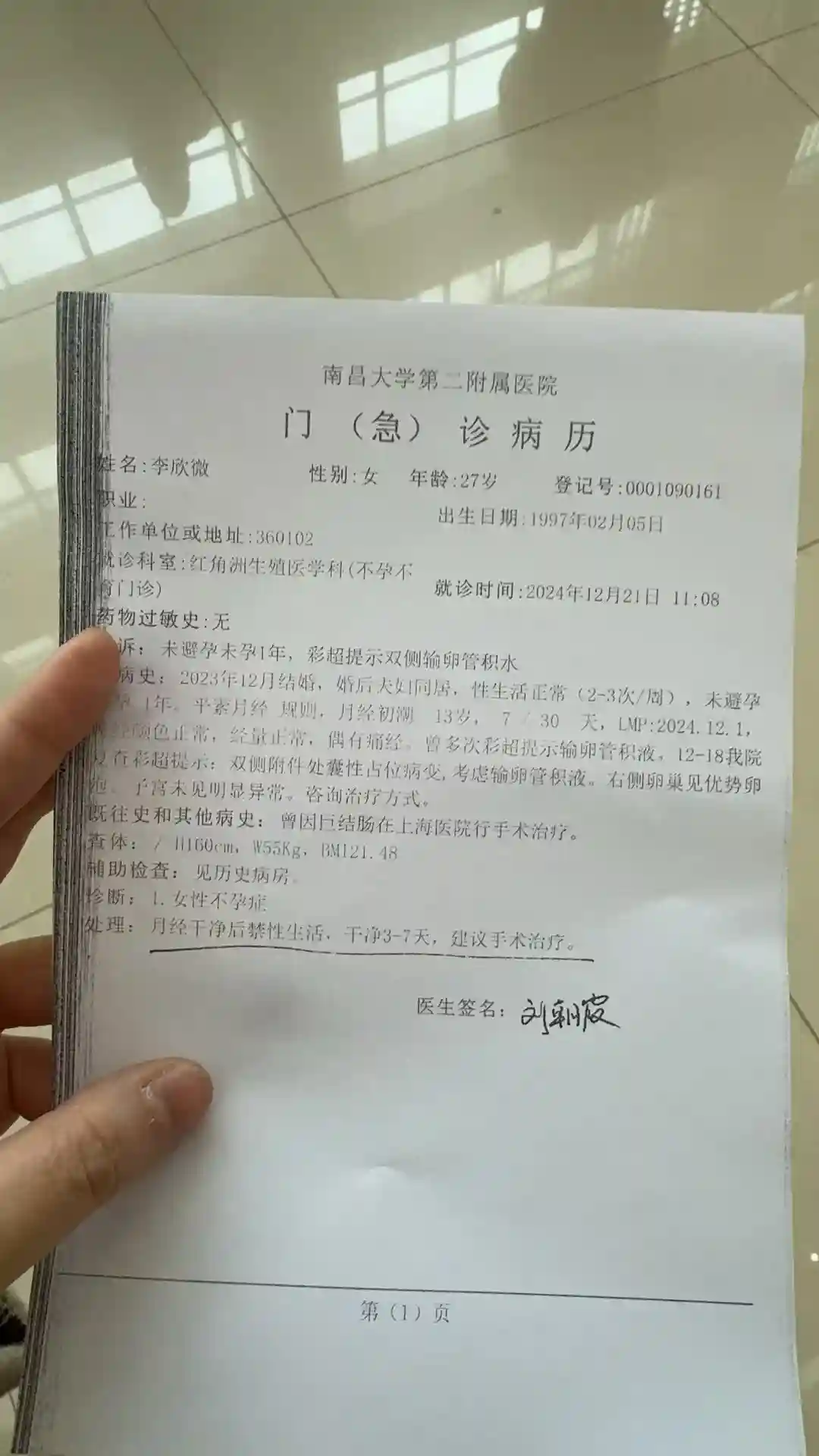 看了很多医生都是建议做手术 有没有南昌备孕的姐妹给点意见(能否不做手术直接试管🧪或者中药调理消散!)因为2017年做过先天性巨结肠的手术(腹腔、盆腔手术史)详见置顶内容🔝 我这个积水大概率也是因为以前做过腹部手术引起的粘连导致的前两天让老公做了精液分析完全没问题 压力给到自己了!!求求推荐南昌看生殖好的医生#备孕 #怀孕 #备孕检查 #怀孕那些事 #备孕日记 #备孕攻略
