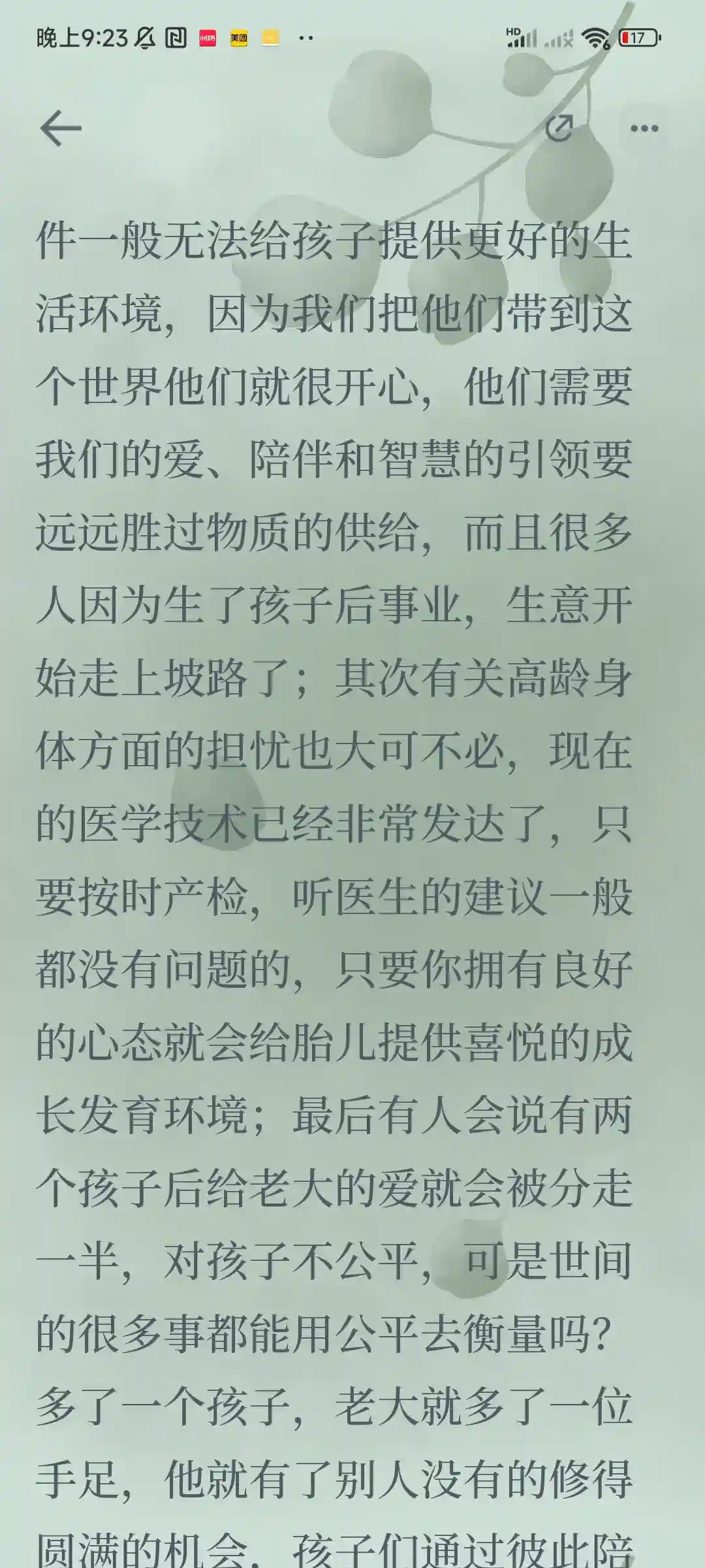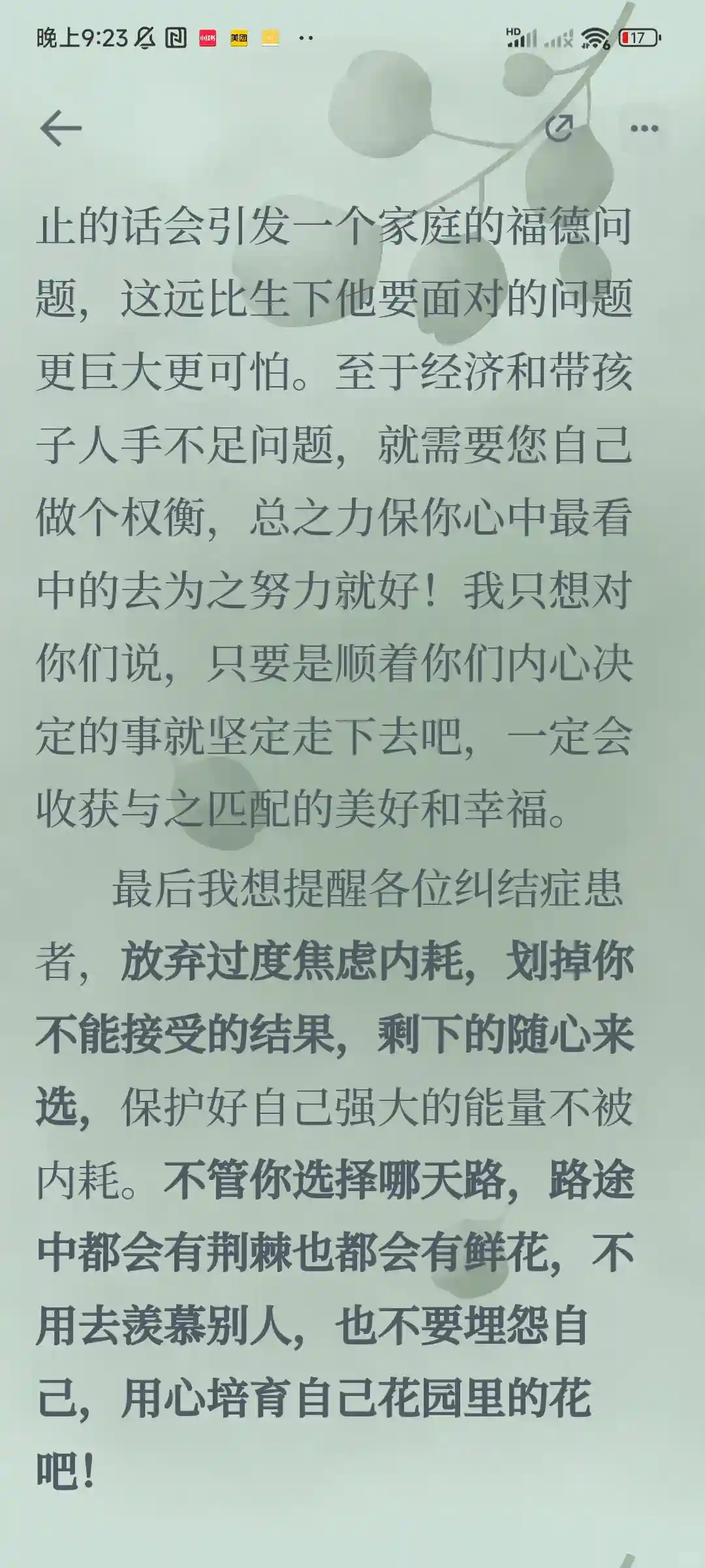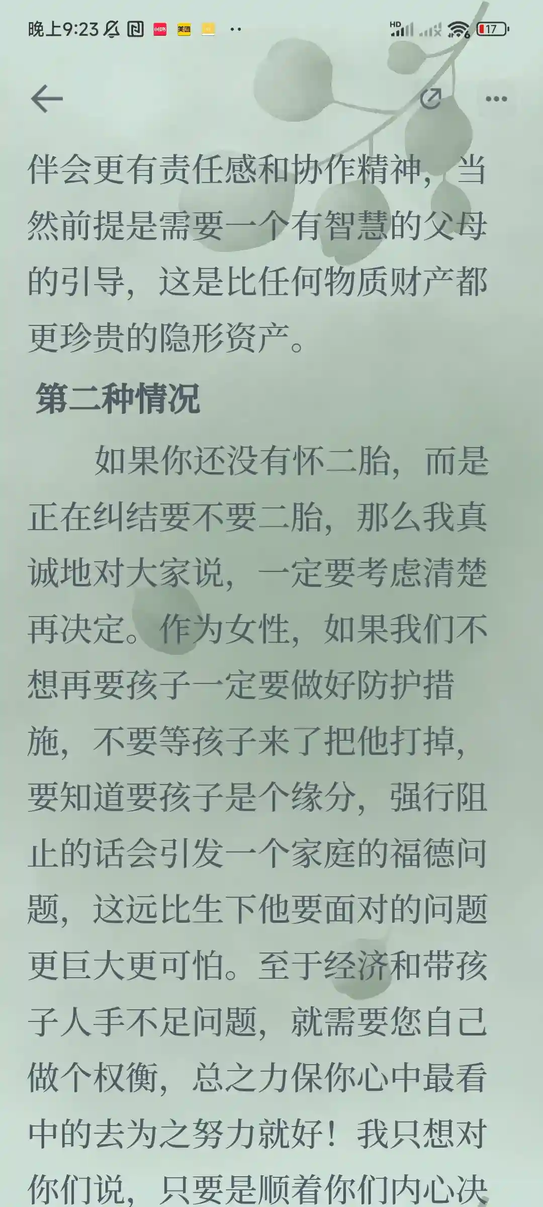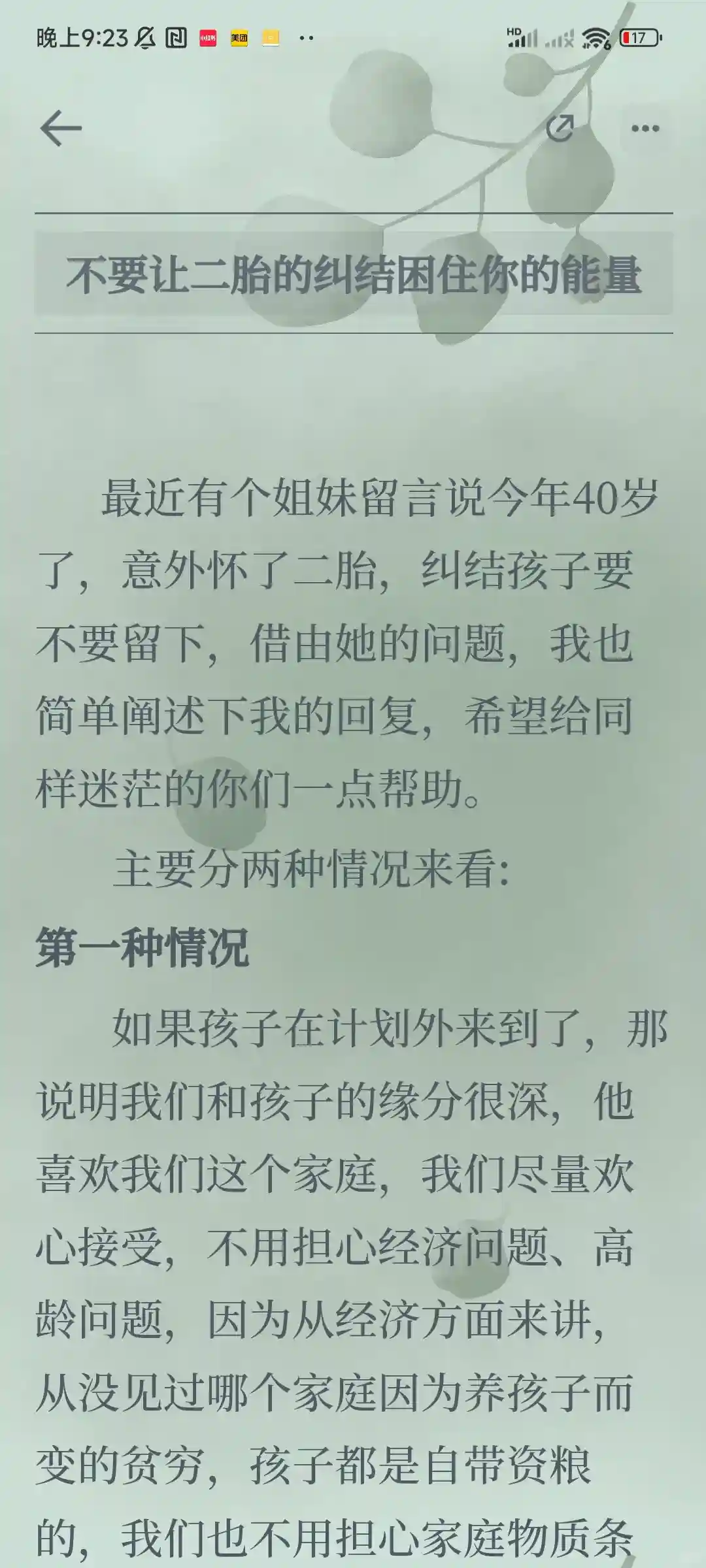 如果你还没有怀二胎,而是正在纠结要不要二胎,那么我真诚地对大家说,一定要考虑清楚再决定。作为女性,如果我们不想再要孩子一定要做好防护措施,不要等孩子来了把他打掉,要知道要孩子是个缘分,强行阻止的话会引发一个家庭的福德问题,这远比生下他要面对的问题更巨大更可怕。至于经济和带孩子人手不足问题,就需要您自己做个权衡,总之力保你心中最看中的去为之努力就好!我只想对你们说,只要是顺着你们内心决定的事就坚定走下去吧,一定会收获与之匹配的美好和幸福。最后我想提醒各位纠结症患者,放弃过度焦虑内耗,划掉你不能接受的结果,剩下的随心来选,保护好自己强大的能量不被内耗。不管你选择哪天路,路途中都会有荆棘也都会有鲜花,不用去羡慕别人,也不要埋怨自己,用心培育自己花园里的花吧!#国学智慧 #生娃娃的那些事 #女性智慧 #二胎