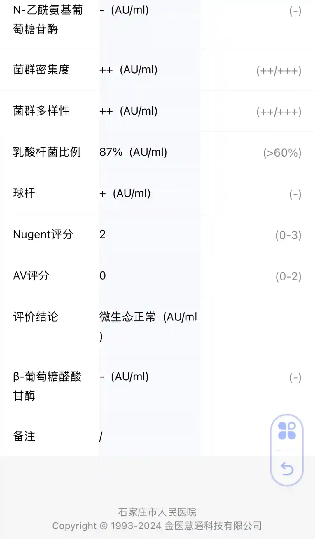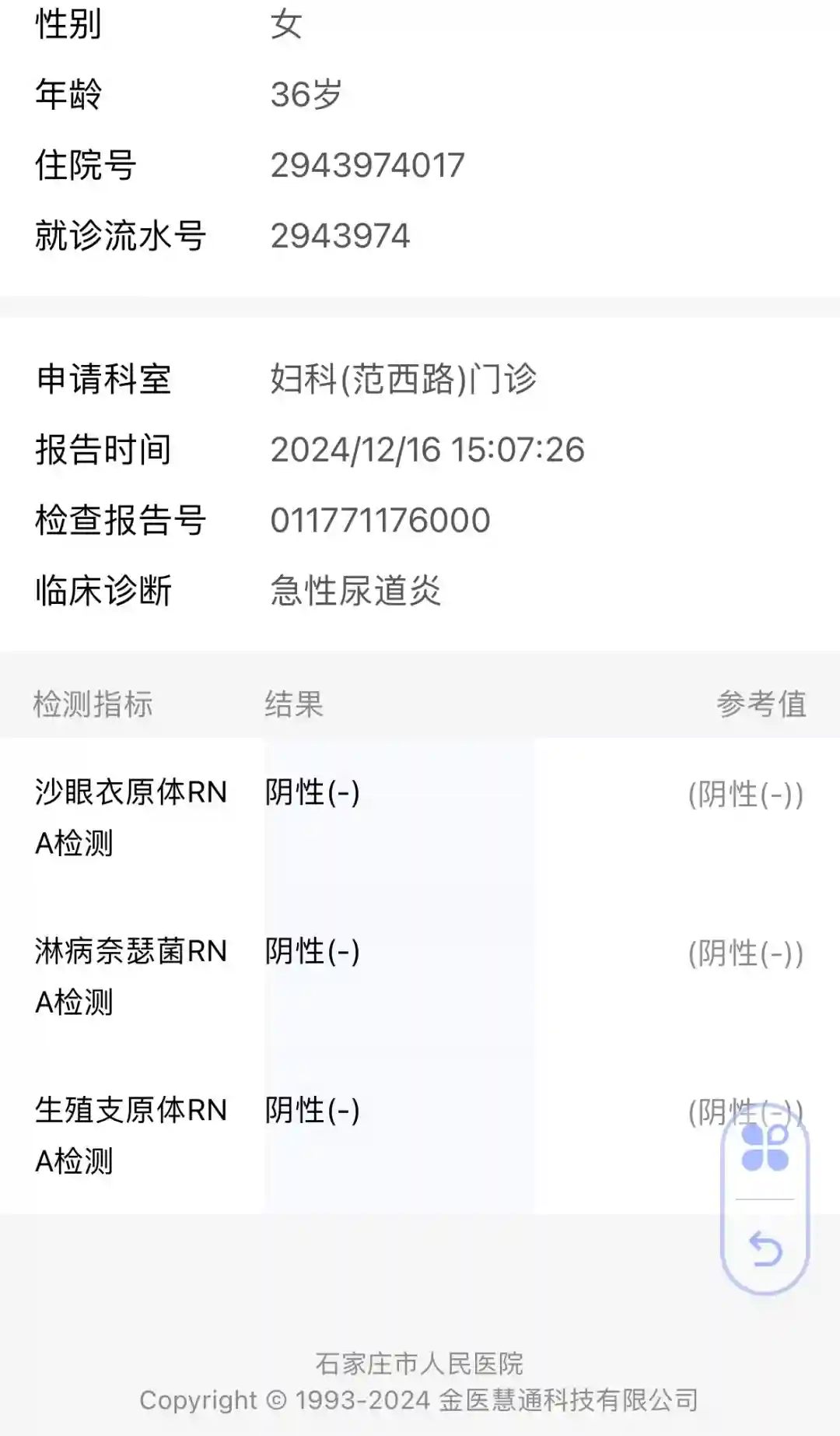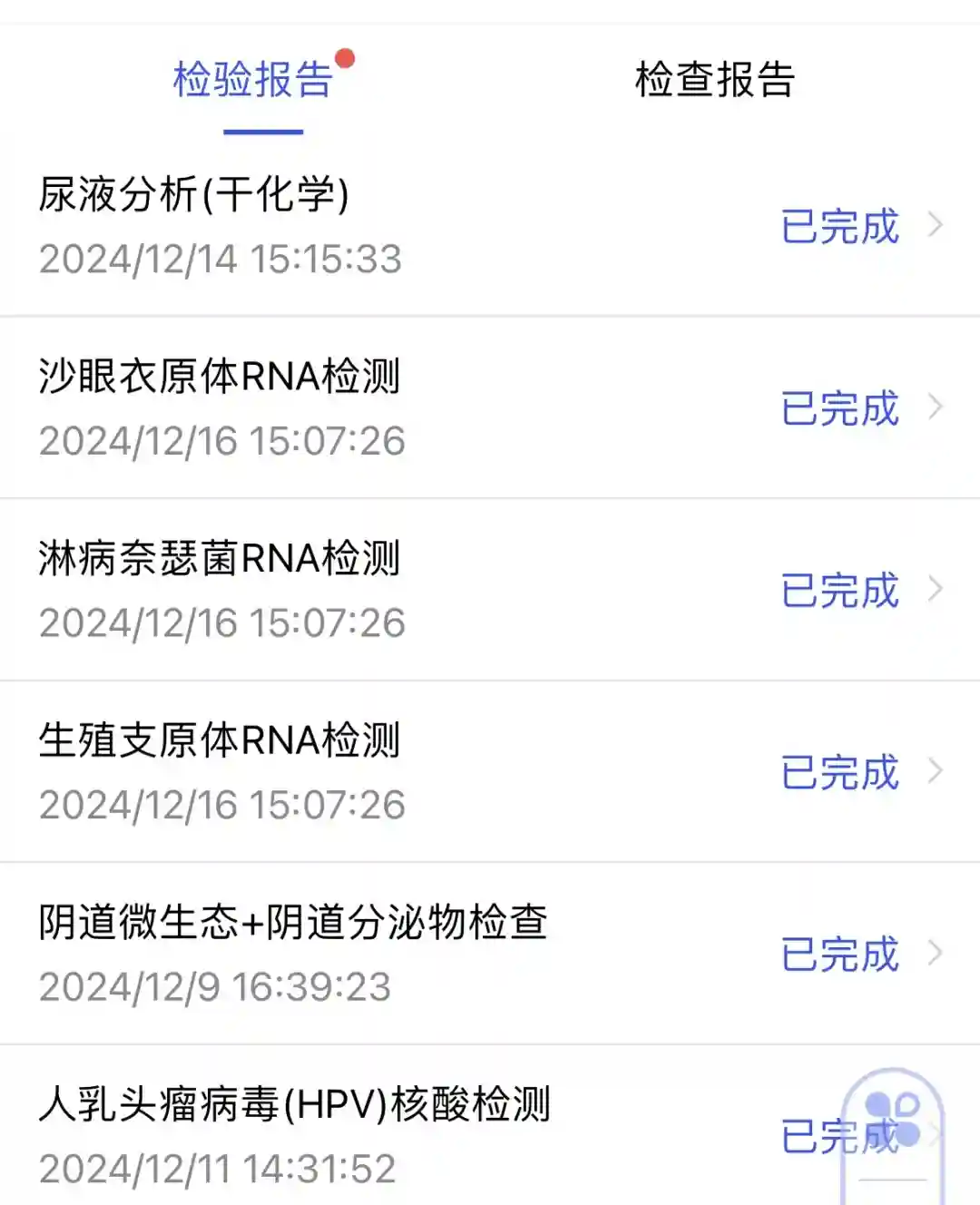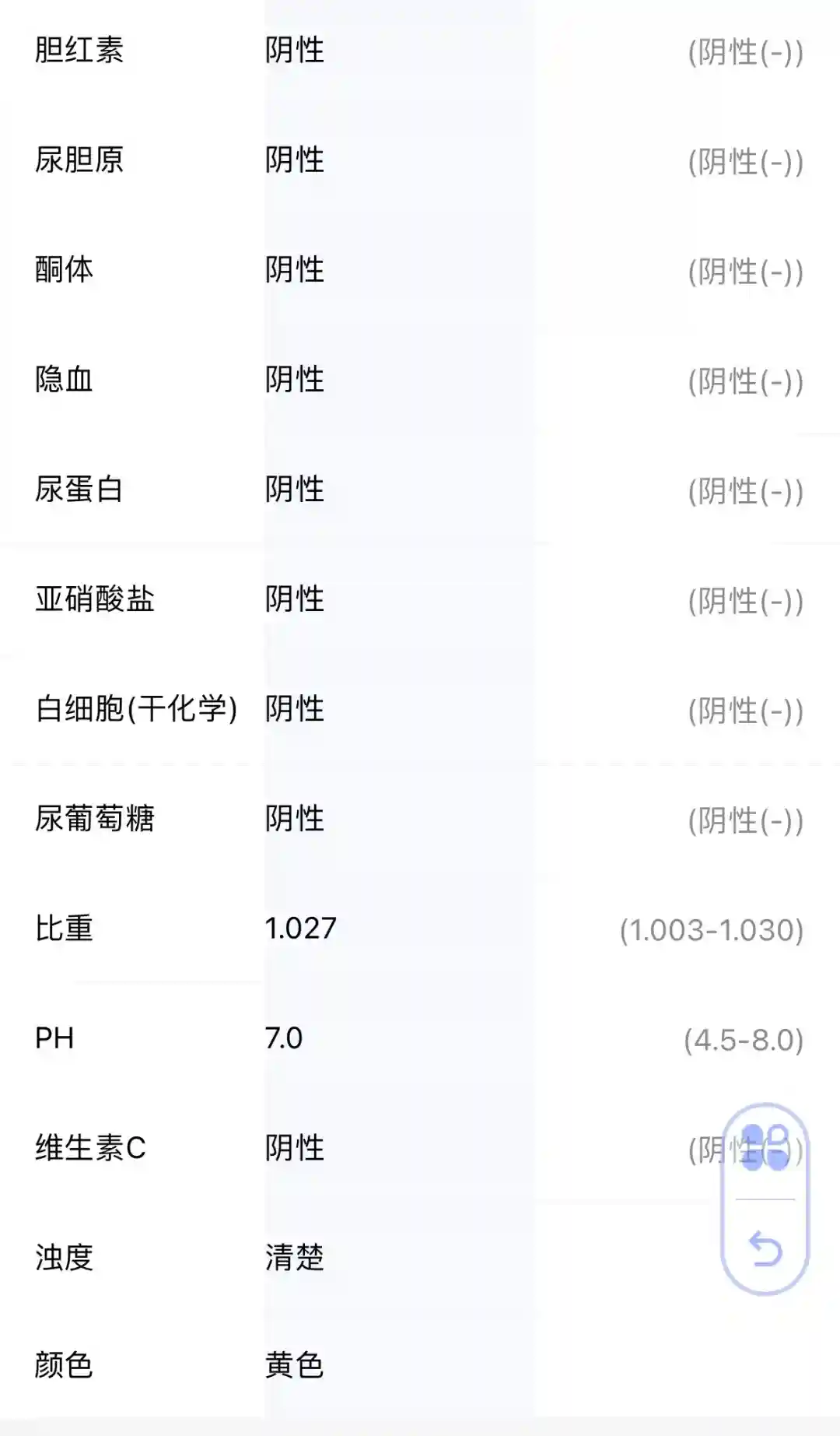 13号的时候觉得有点尿频,小腹有点坠胀,不放心又去市人民,这次换了个主任大夫。去了描述了下我的症状,说可能是尿道炎,去验个尿吧,然后再去验个宫颈支原体衣原体。然后我就去验尿,半个小时出了结果,指标也正常。另一个检查结果需要两天出来。我拿验尿的结果去找大夫,大夫说,这个结果没有问题,即使宫颈支原体衣原体有问题的话也不会很严重,我说之前那个大夫说我有慢性盆腔炎,她又让我躺检查床上摸了摸,说没事,盆腔很健康,我说那之前开的药还吃吗?她说那就别吃了,有些药吃多了未必是好事,回家观察观察吧。