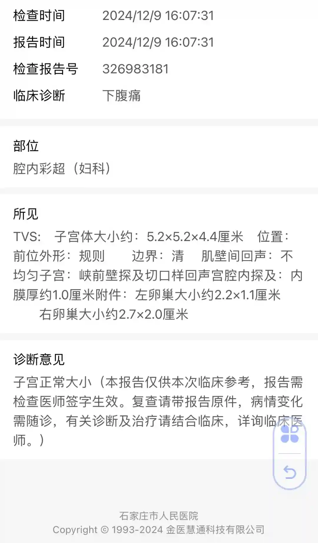 起因是我7号的时候觉得小腹疼,就像平时来亲戚之前那种感觉。但是5号刚来完的,觉得不正常,9号去了市人民医院妇科,找了张XX大夫,做了个B超,结果没事,又让我做个分泌物检查,结果也没事,还让我检查下hpv,结果还是没事。说我估计有点慢性盆腔炎,给我开了两盒花红颗粒回家喝。