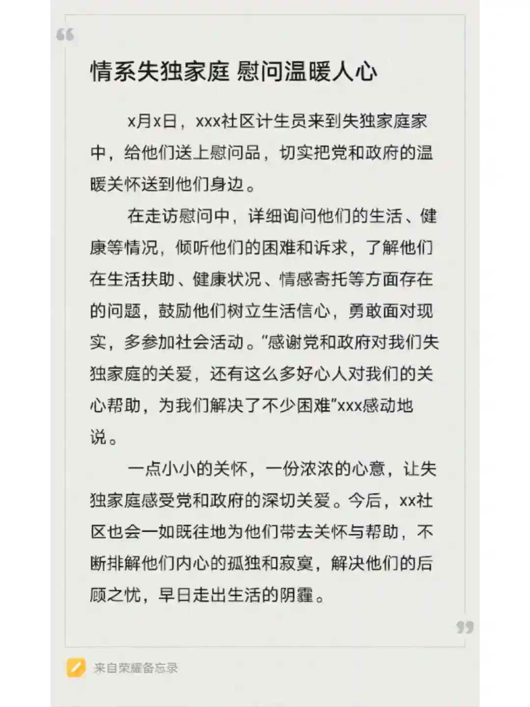 慰问失独家庭的简讯