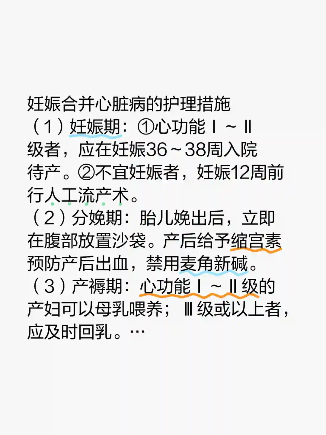 (3)产褥期:心功能Ⅰ~Ⅱ级的产妇可以母乳喂养;Ⅲ级或以上者,应及时回乳。