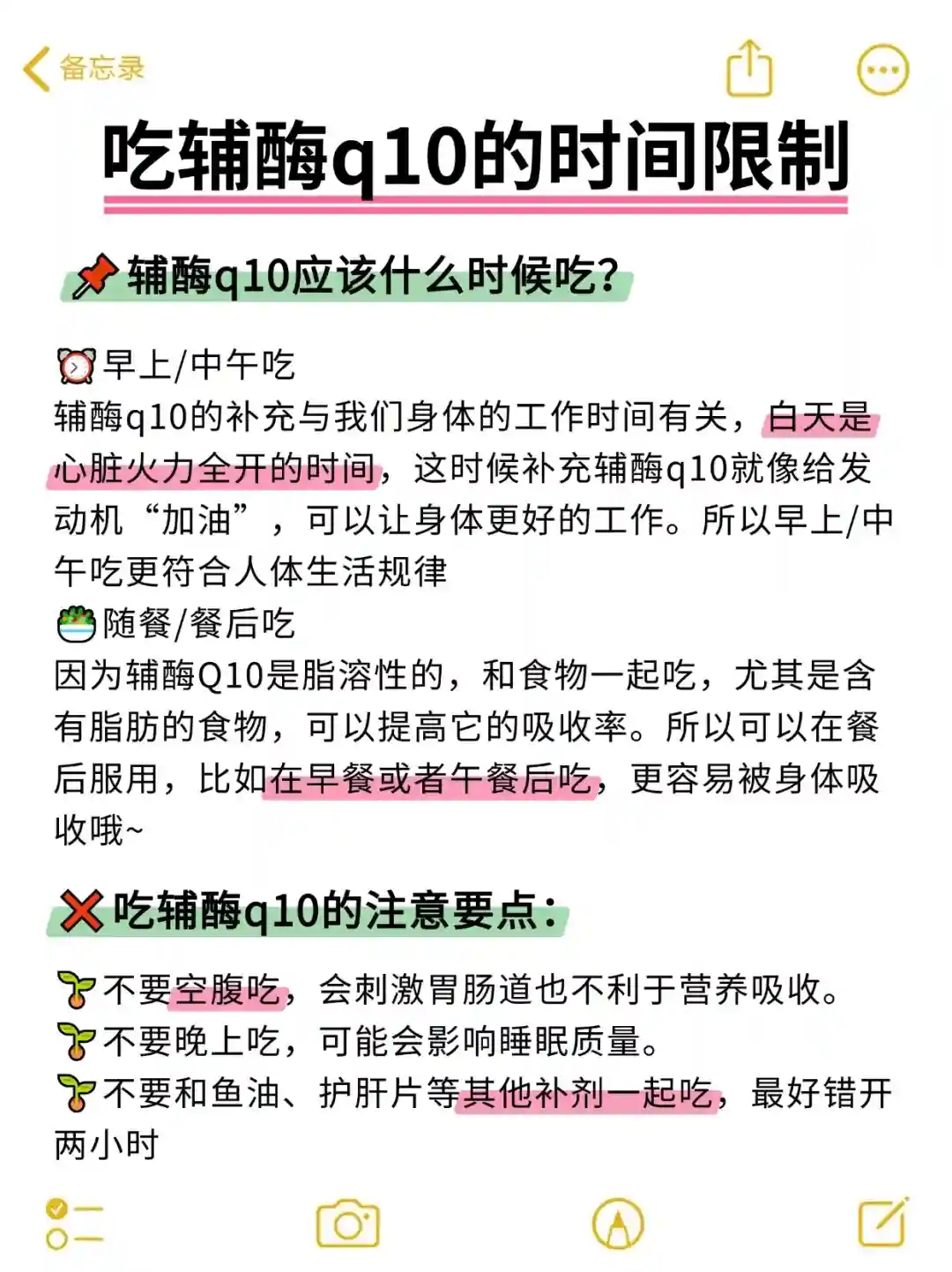 2⃣辅酶q10是脂溶性的,不要空腹吃,普遍来说是早上或中午随餐吃的吸收会更好~