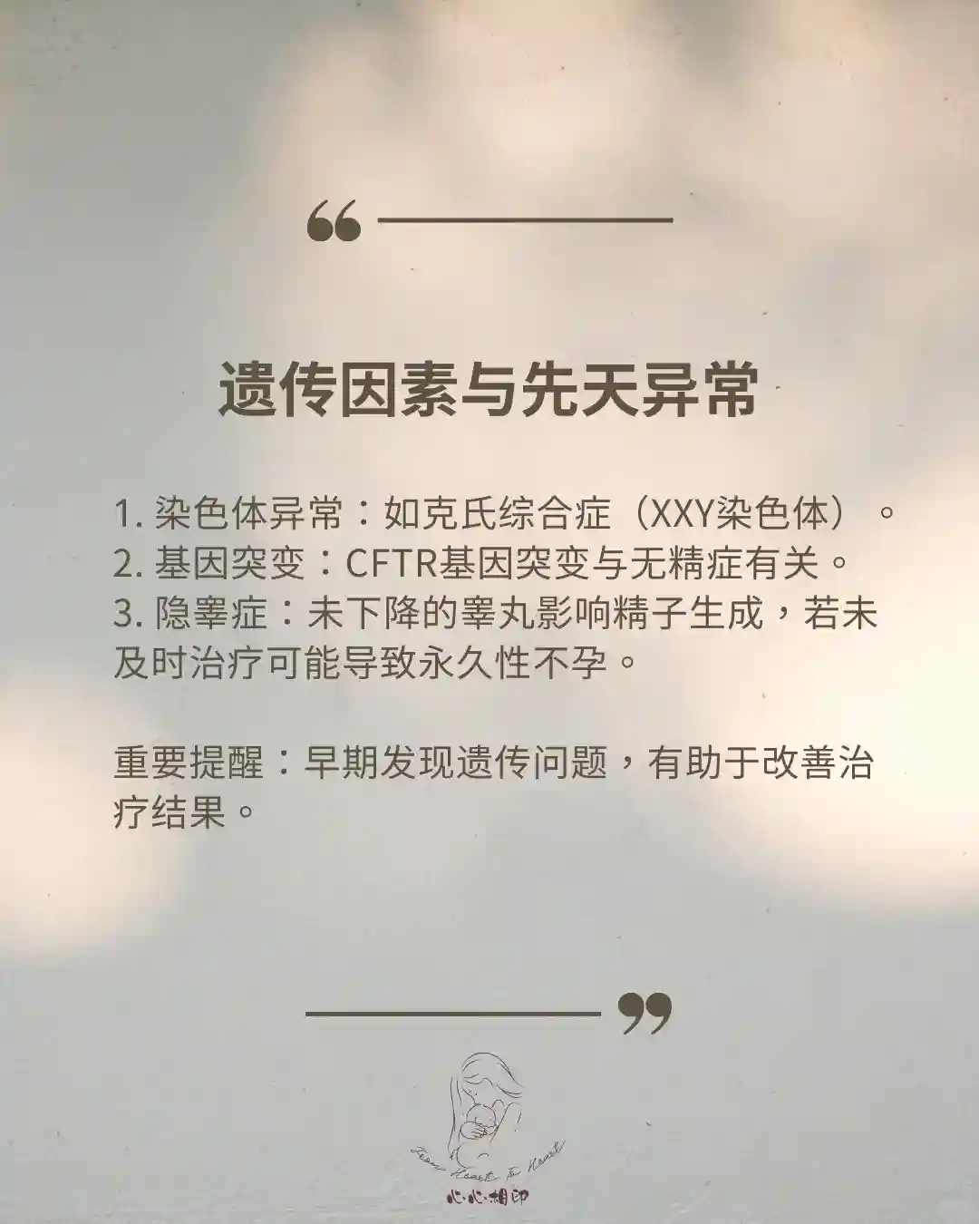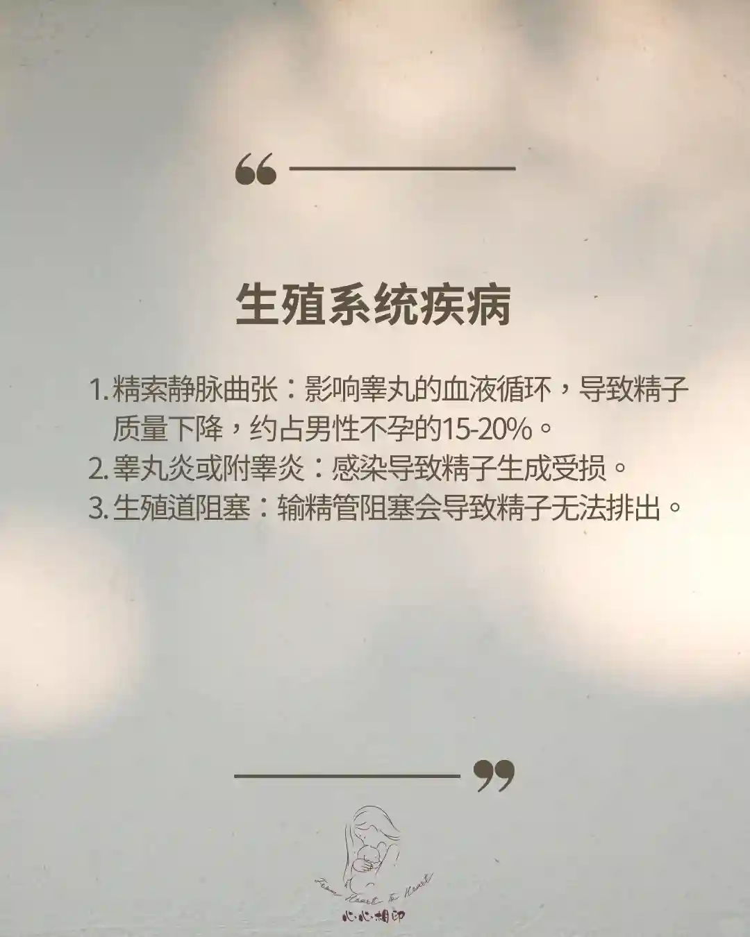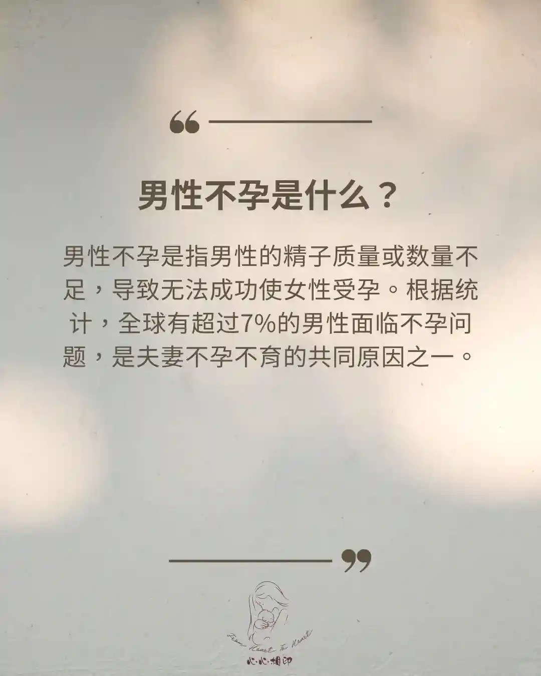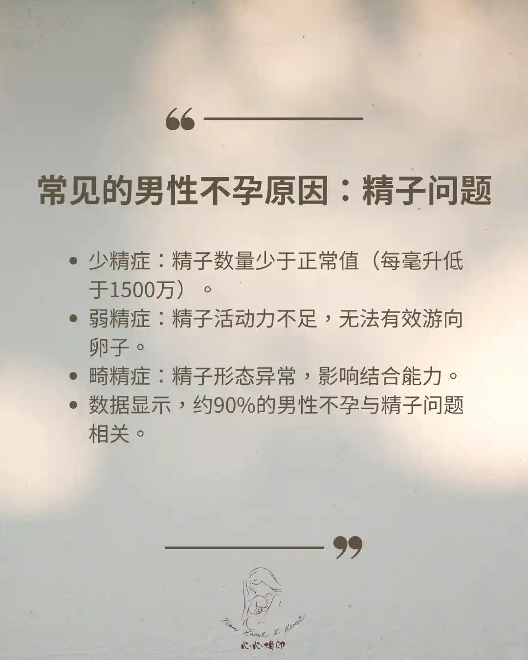 男性不孕的主要原因通常集中在精子数量、质量或活动力的问题。比如,少精症就是当每毫升精液的精子数量低于 1500万时,这会大大降低受孕机会。另一个常见的问题是 弱精症,这是精子活动力不足,无法有效游向卵子进行受精。还有 畸精症,即精子的形态异常,这会影响精子与卵子的结合能力。这些精子问题大约占据了 90%的男性不孕案例。