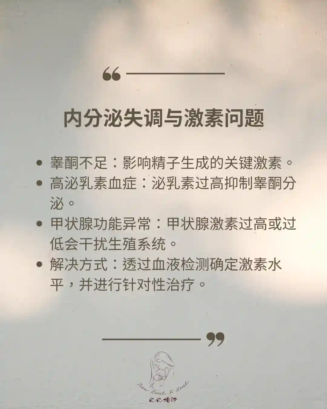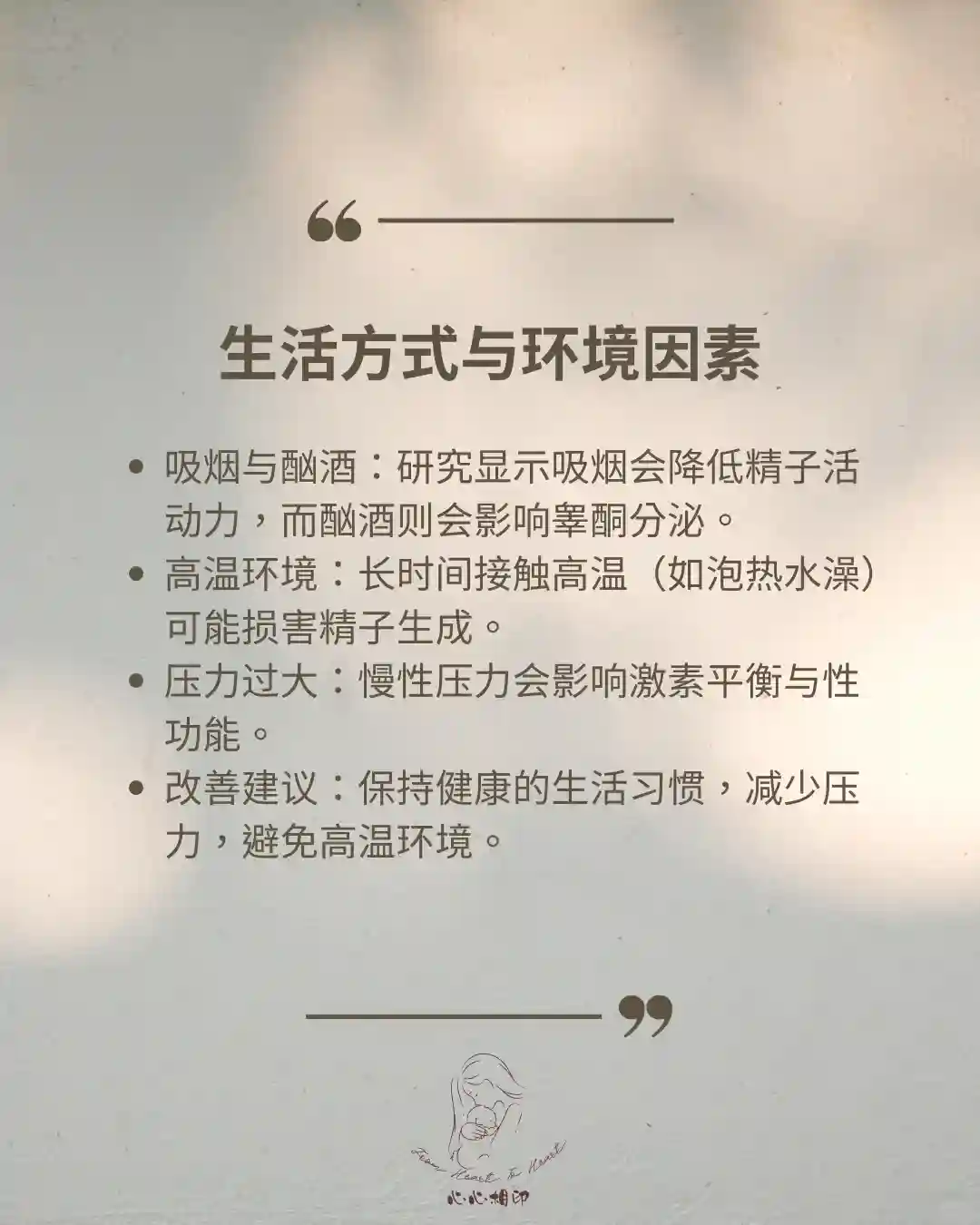 除了精子问题,内分泌失调也是男性不孕的一大因素。睾酮不足会影响精子的生成,而高泌乳素或甲状腺功能异常则会对生殖系统造成干扰,进一步降低受孕机率。另外,生活习惯和环境因素也会显著影响男性的生育能力。吸烟、酗酒以及长时间暴露于高温环境中(如泡热水澡),都可能损害精子的质量和活动力。慢性压力也会影响激素水平,进而影响生育能力。