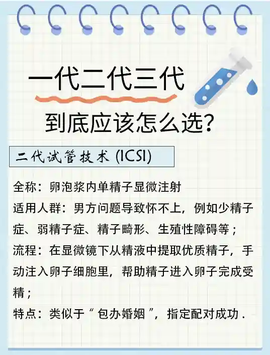🧐2. 试管二代(ICSI): ICSI技术是在试管一代的基础上发展而来的,针对男性精子质量较差或无法使卵子自然受精的患者。在ICSI过程中,👩🏻⚕️会将单个精子直接注入卵子的胞浆内,以提高受精成功率。ICSI技术主要用于解决男性因素不孕和某些辅助生殖技术失败的情况。