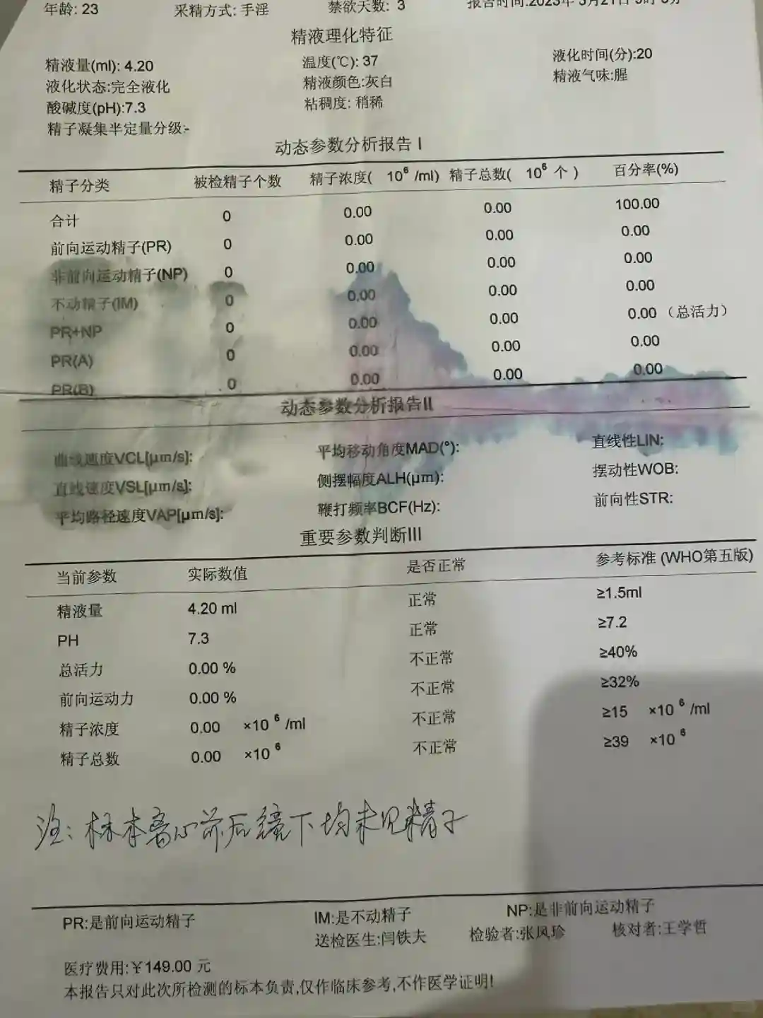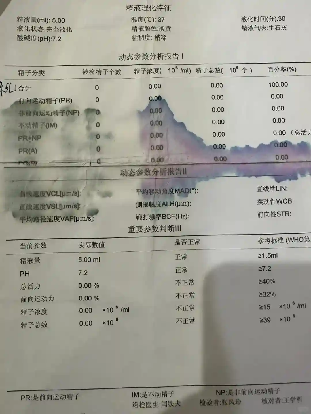 当时是从家附近的医院检查的,由于城市比较小我们决定上隔壁城市再复查一下。图一是复查的第一次依旧全是“0”,当时心如死灰一样。医生给开了一个月的药,一个月之后复查。