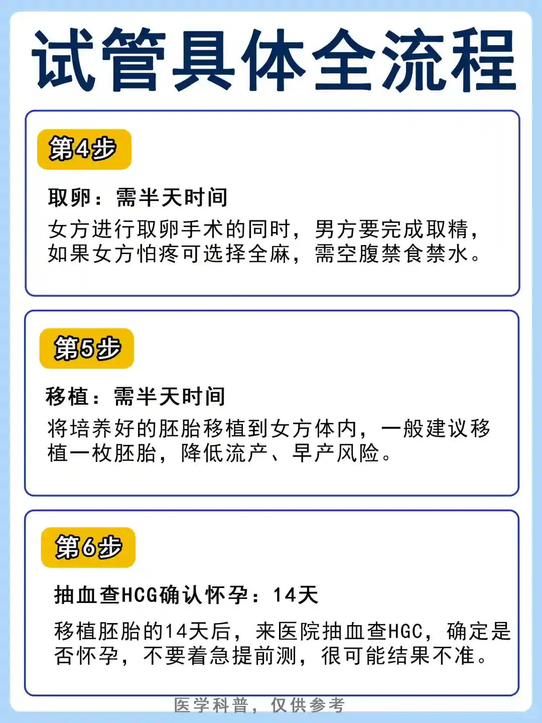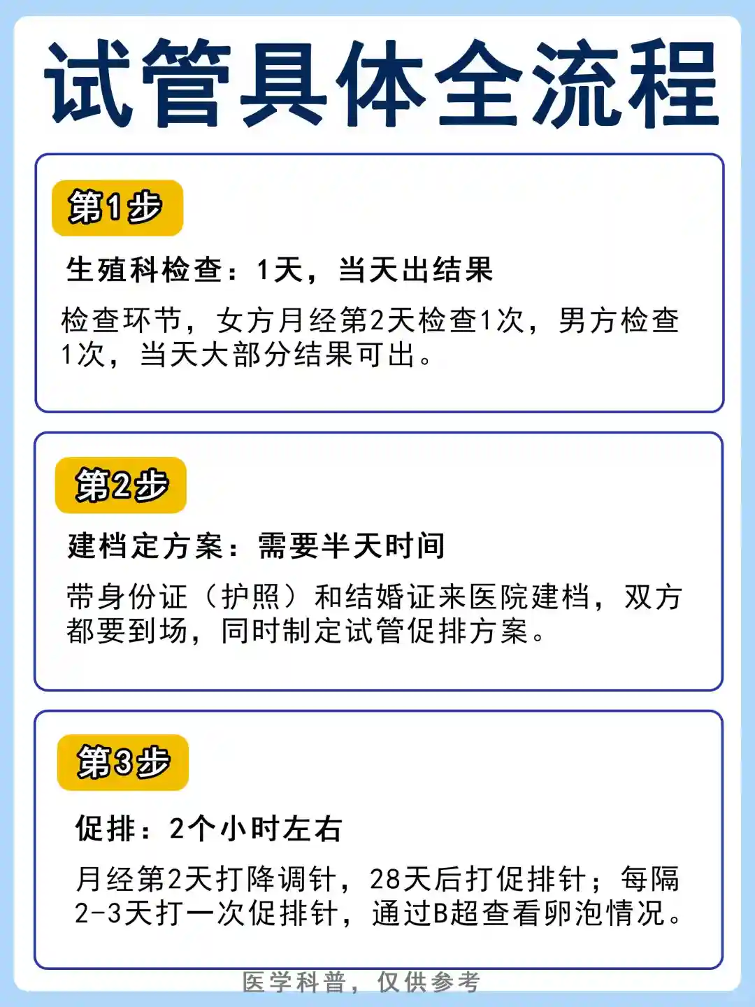 初诊-完善检查-建档-定方案-促排-取精取卵-胚胎培养-胚胎移植-胚胎保存-验血查是否怀孕