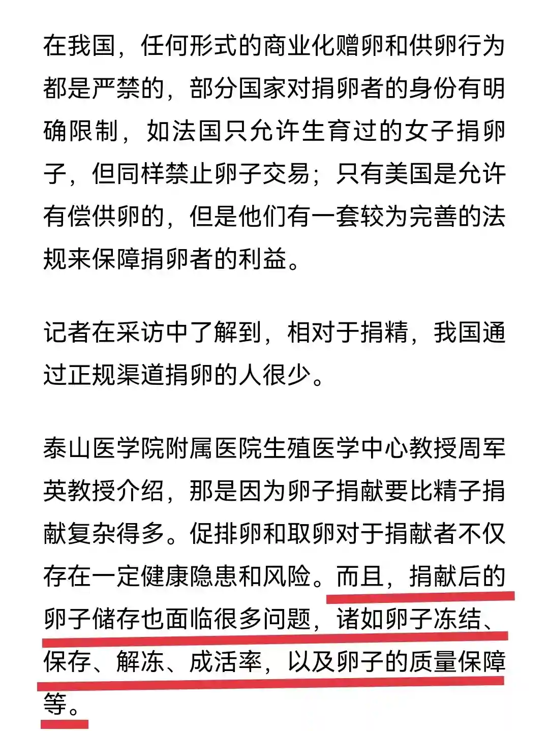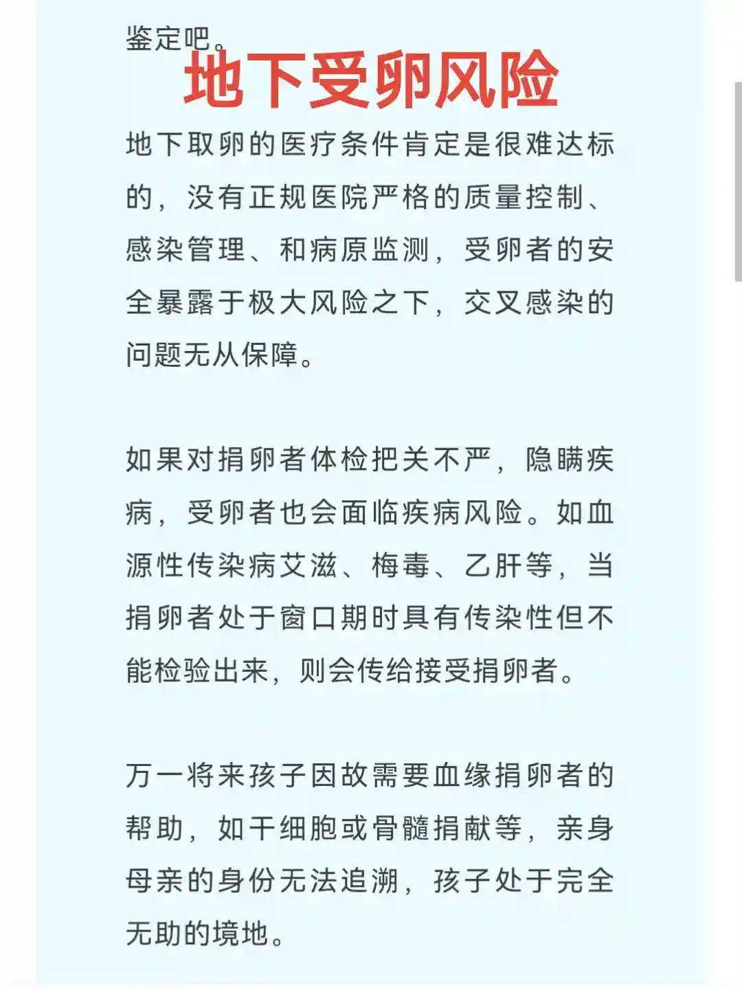 🔴技术缺失风险正规的luan子捐赠通常会将luan子冷冻半年,这主要是为了确保安荃性,特别是排除捐赠者携带HIV等传染病的风险。在捐赠过程中,即便捐赠者接受了荃面健康检查,但仍可能在取luan前感ran某些bing毒。冷冻半年的时间可以在发现捐赠者感ran问题时及时通知受者采取措施。而luan子的保存有着严格要求,冷冻luan子的复苏技术要求也很高。地下试管根本不可能具备这些软硬件保障措施,无法保存luan子质量易失活,这对受luan者来说意味着可能接受质量无保障的luan子,从而影响受精能力和胚胎发育,损害自身的生育权益和后代的健康。