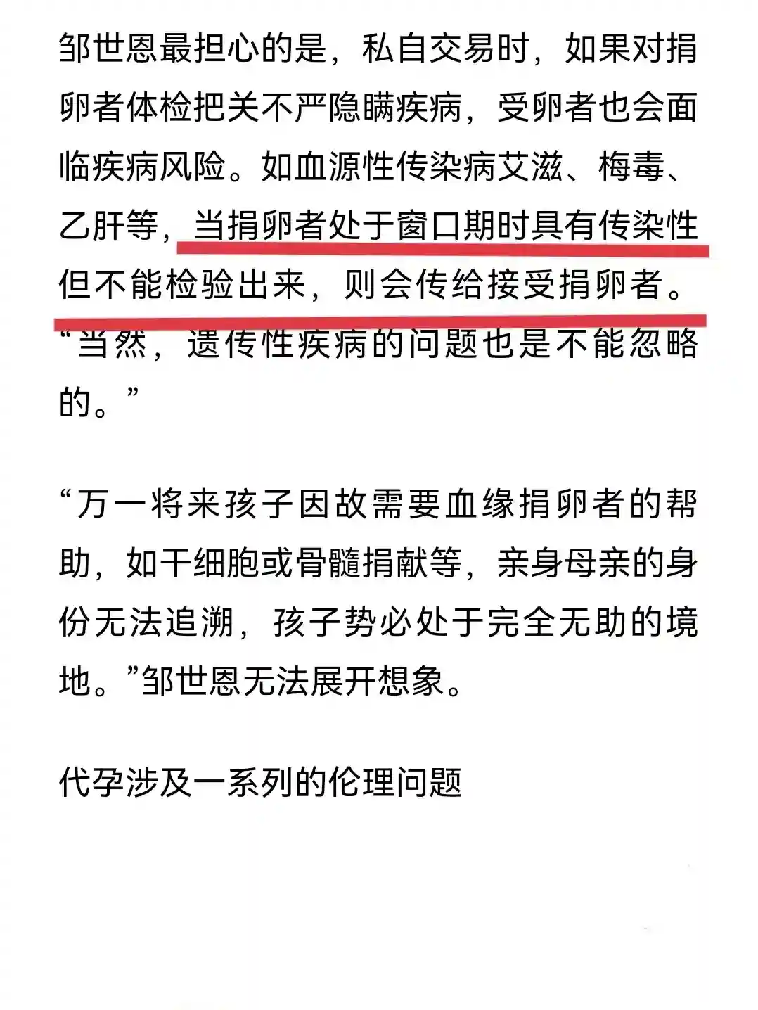 已知的遗传病多达上千种,在地下捐luan这种混乱的环境下,地下机构根本不会花费大量时间和精力去筛查,很有可能把有家族遗传病史者的luan子提供给受luan者,这无疑会增加受luan者后代患遗传病的风险,给家庭带来沉重的负担和无尽的痛苦。