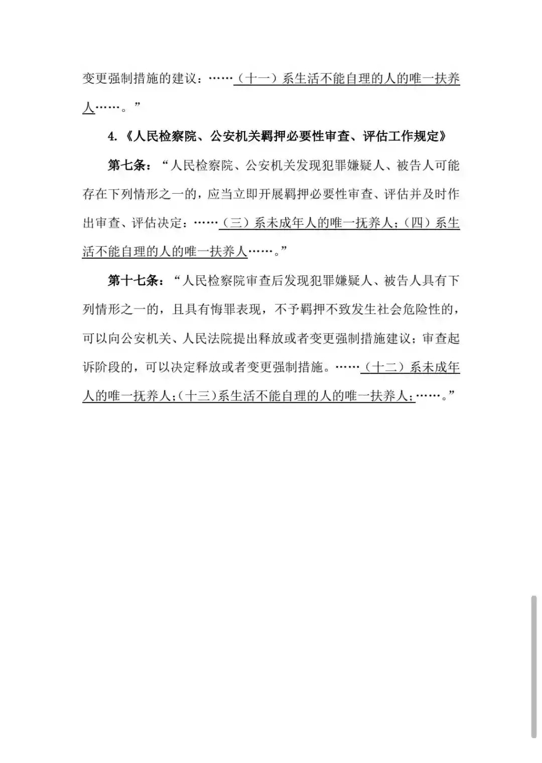 第7条(第17条类似):“检察院、公安机关发现犯罪嫌疑人、被告人可能存在下列情形之一的,应当立即开展羁押必要性审查、评估并及时作出审查、评估决定:……(三)系未成年人的唯一抚养人;(四)系生活不能自理的人的唯一扶养人……。”