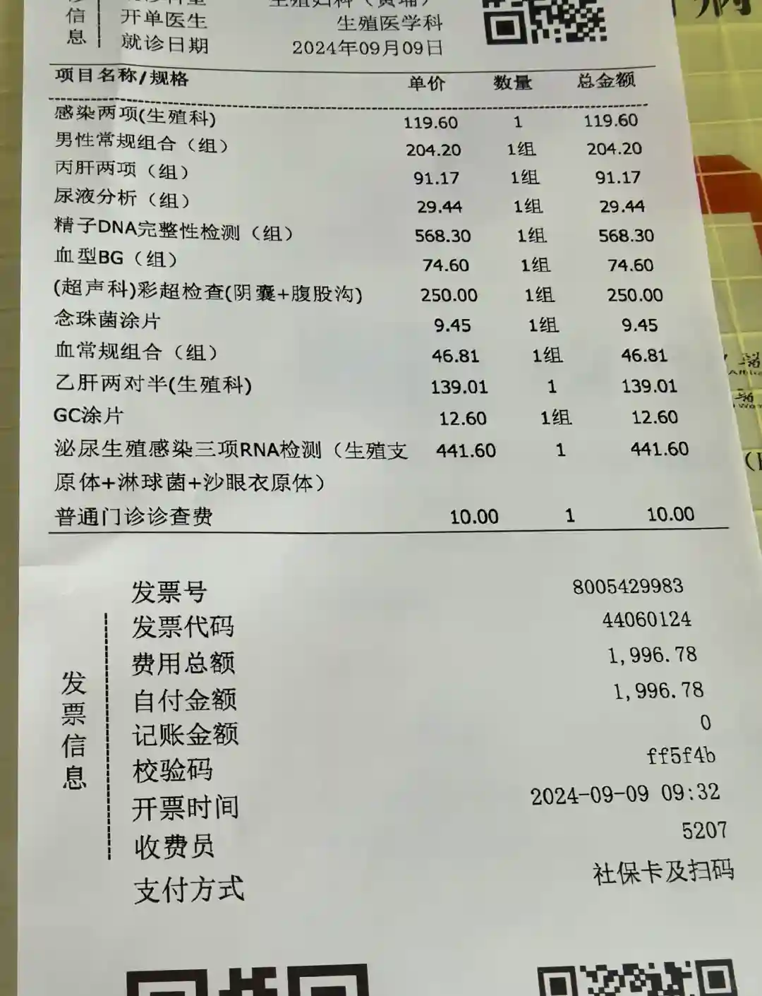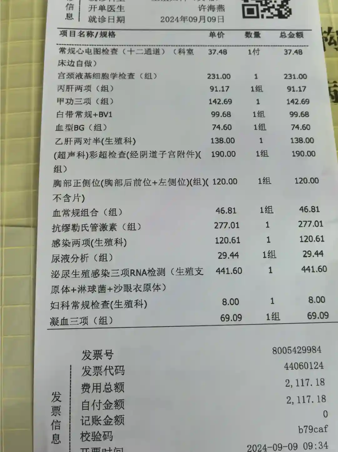 一年过去了,依旧没有动静。一是因为我们分隔两地同房少;二是我们俩本身多多少少都有点问题,我子宫环境不好,B超怀疑子宫腺肌症,老公严重弱精。上个月促排了,到排卵的时候,老公可能因为压力大,同房有障碍(平时没问题)。昨天来月经了,立马在广三挂号。由于之前就下定决心,如果来月经了就去做人授,于是早早地把前期的检查和今年的体检单都收集好,今天一起带过去医院。跟医生说了想人授的想法后,她就让我把检查单都给护士,护士会把有用的检查单挑出来,有缺的就开单给我去做检查。我的性激素六项、HPV、肝功、肾功、地贫不用再检查了,老公的精液分析、地贫也不需检查。最终开的检查,女方2117.18元,男方1996.78元,合计4113.96元。