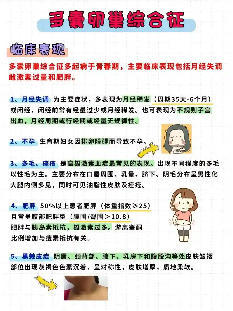 主要表现为月经周期不规律、不孕、多毛或豆豆,是常见的女性内分泌问题