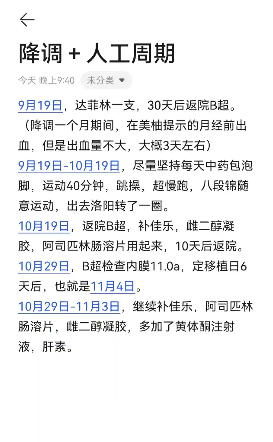 11月4日移植当天,带好老公和结婚证,身份证,病历本吃了饭就悠悠哒哒的去了。毕竟我已经有了几次失败经验,所以心态真的挺好,和老公商量好了,如果这次不行就都调理一下重新开始。由于我是最后一个胚胎了,妇幼还给我退了半年胚胎保管费,拿着退费单和缴费单去一楼缴费,看见手术单上的签字是马淳大夫,我特兴奋给我老公说,你看,传说中的送子娘娘。队友笑着说,你终于等到她了移植后躺了大概30分钟,就去一楼打针。还没出妇幼门,真的感觉到了针扎感,就好几下,但是肯定没有那么快。移植后每天用药有阿司匹林,纷乐,二甲双胍,地屈孕酮,雪诺同,肝素。
