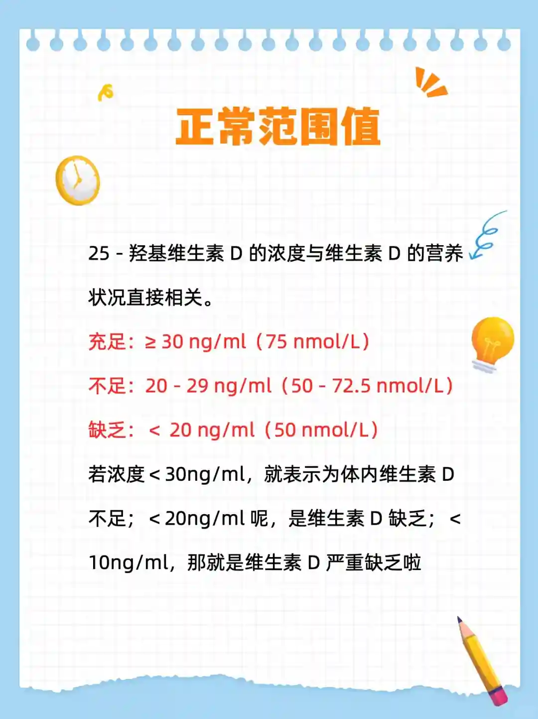 👉 25 - 羟基维生素 D 的浓度与维生素 D 的营养状况直接相关。若浓度<30ng/ml,就表示为体内维生素 D 不足;<20ng/ml 呢,是维生素 D 缺乏;<10ng/ml,那就是维生素 D 严重缺乏啦