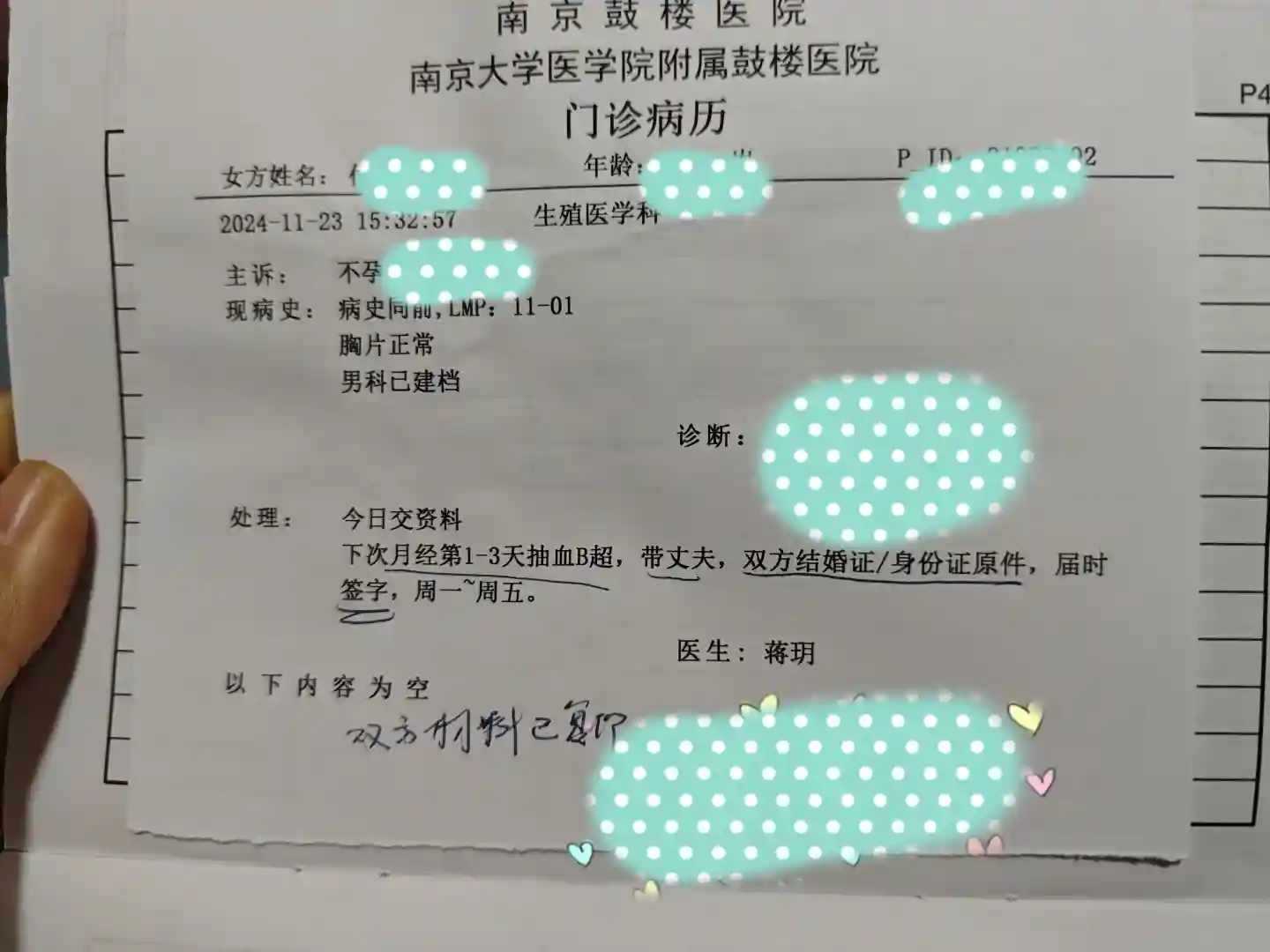 ①男方按要求带资料(两次精液检查,且必须有一次是在鼓楼医院做的),女方病历本,到北院1号楼3楼男科诊室签到,医生看完后,没什么问题,医生会在女方病历本上签字盖章,代表男科已建档。