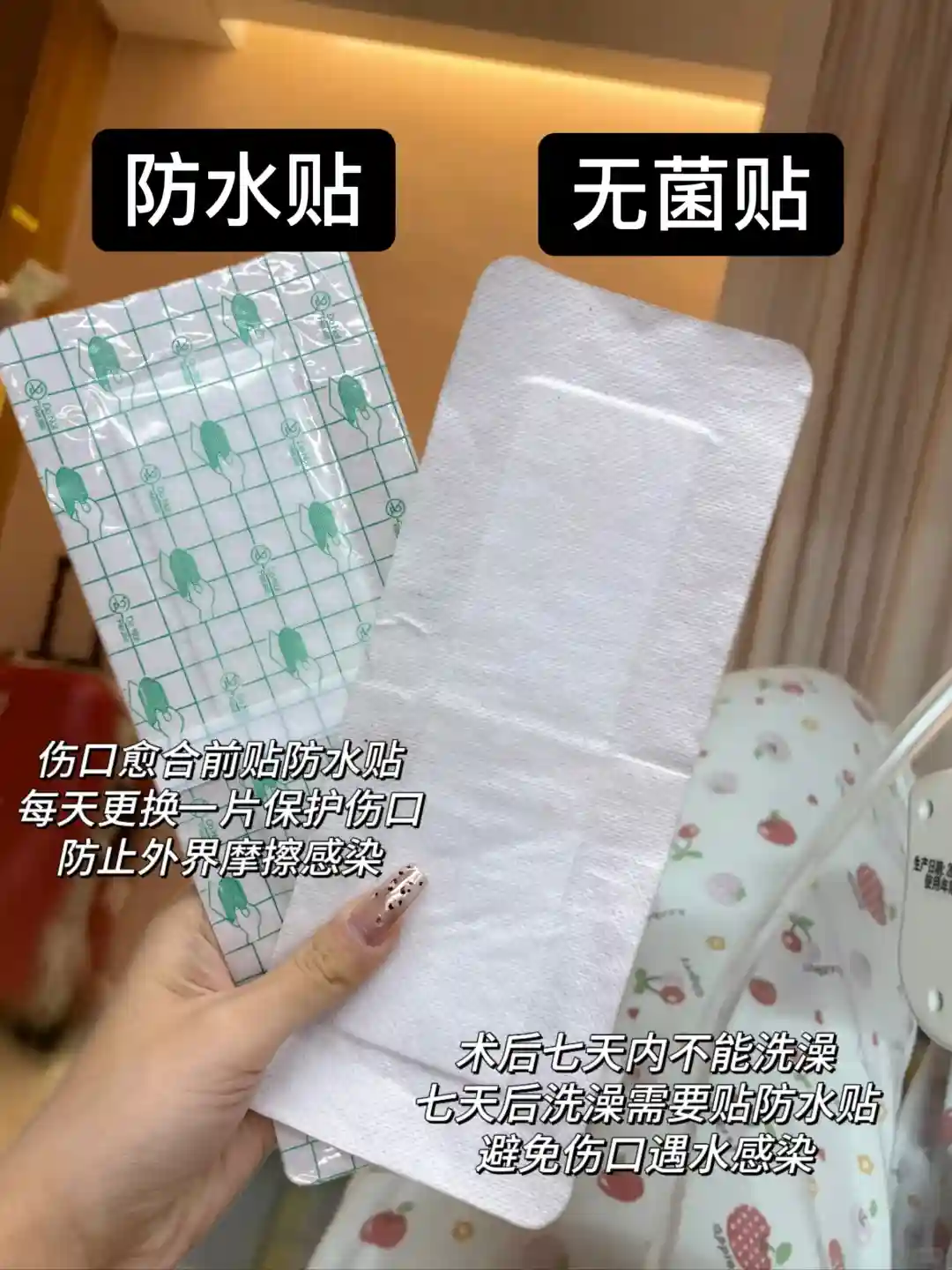 伤口愈合前,用无菌贴来保护伤口,避免衣服摩擦。