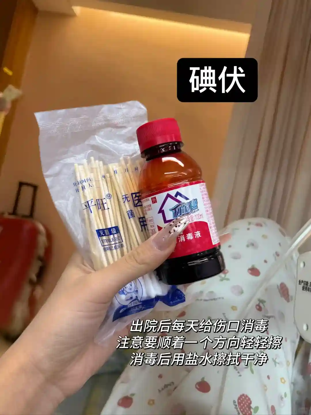 蘸取碘伏擦拭疤痕处,出院后早晚各一次,顺着一个方向擦拭,切记不要来回扫,消毒后一定用盐水擦干净避免色沉